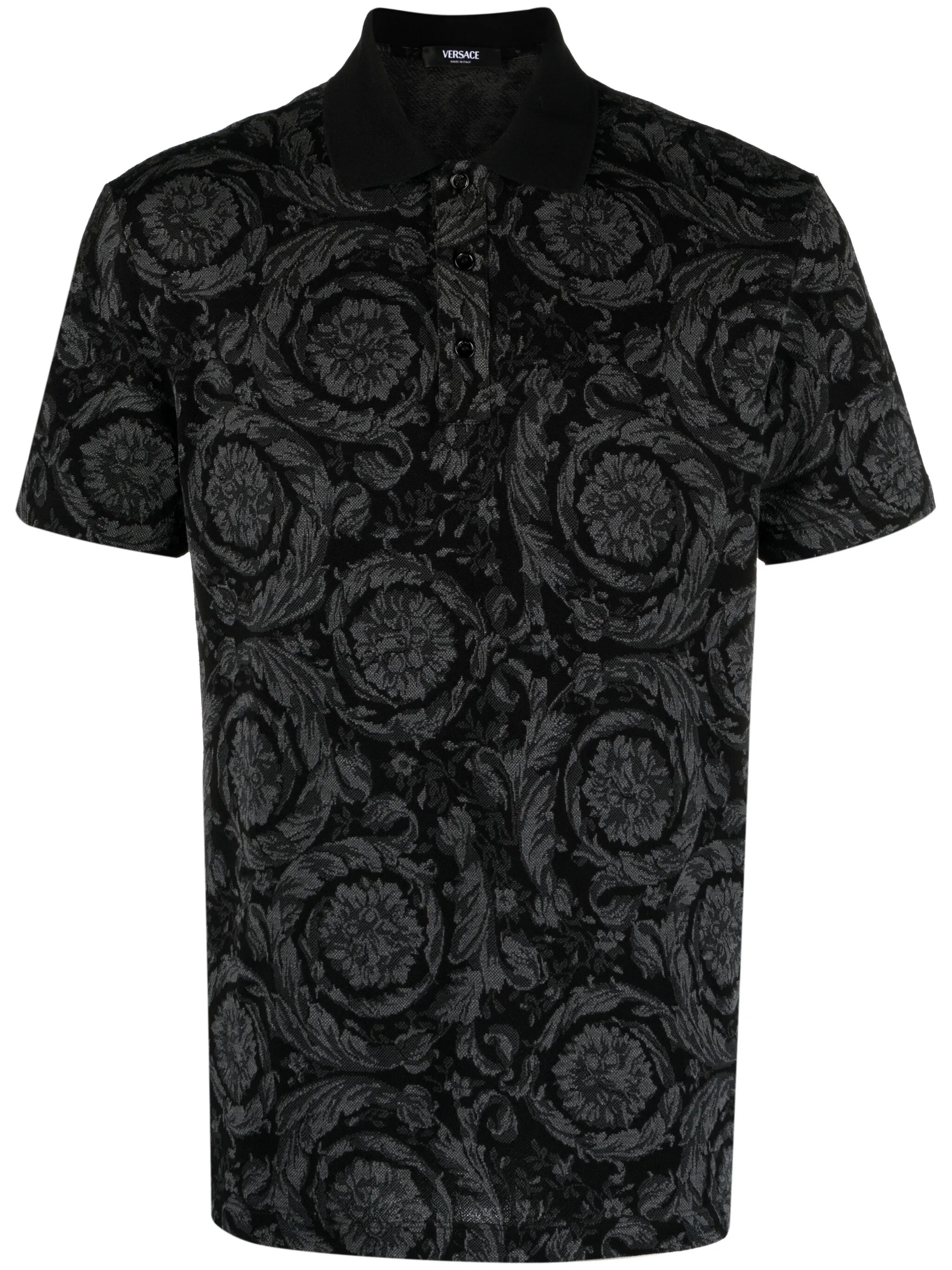- medium grey - cotton - pique weave - signature Barocco jacquard - ribbed polo collar - front button placket - short sleeves - straight hem Materials & Product Care Cotton 100% Size & Fit - The model is 1.86 m wearing size M.