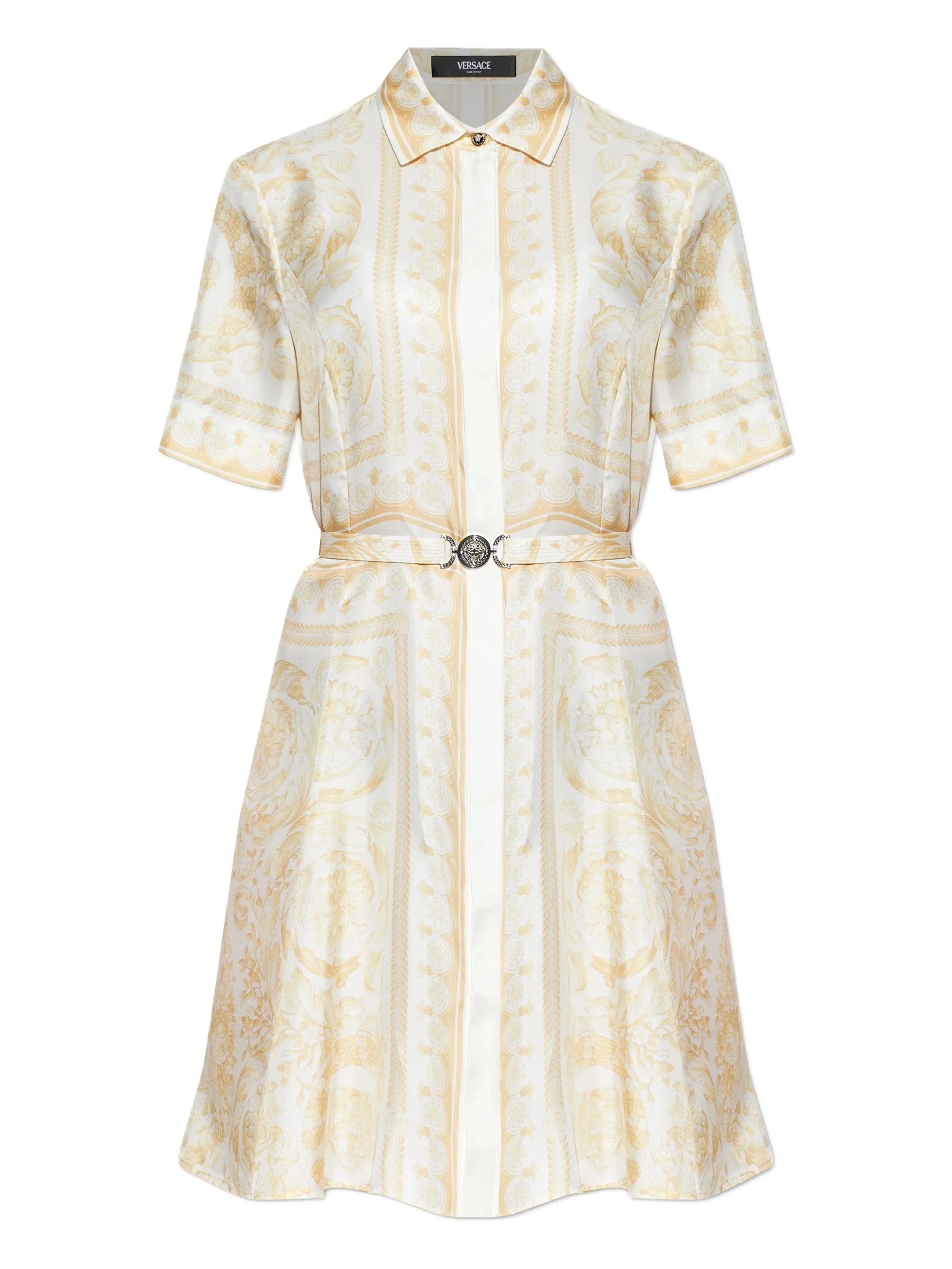 - white and beige - print - belt - short sleeves - shirt collar - a-line skirt Materials & Product Care Silk 100%
