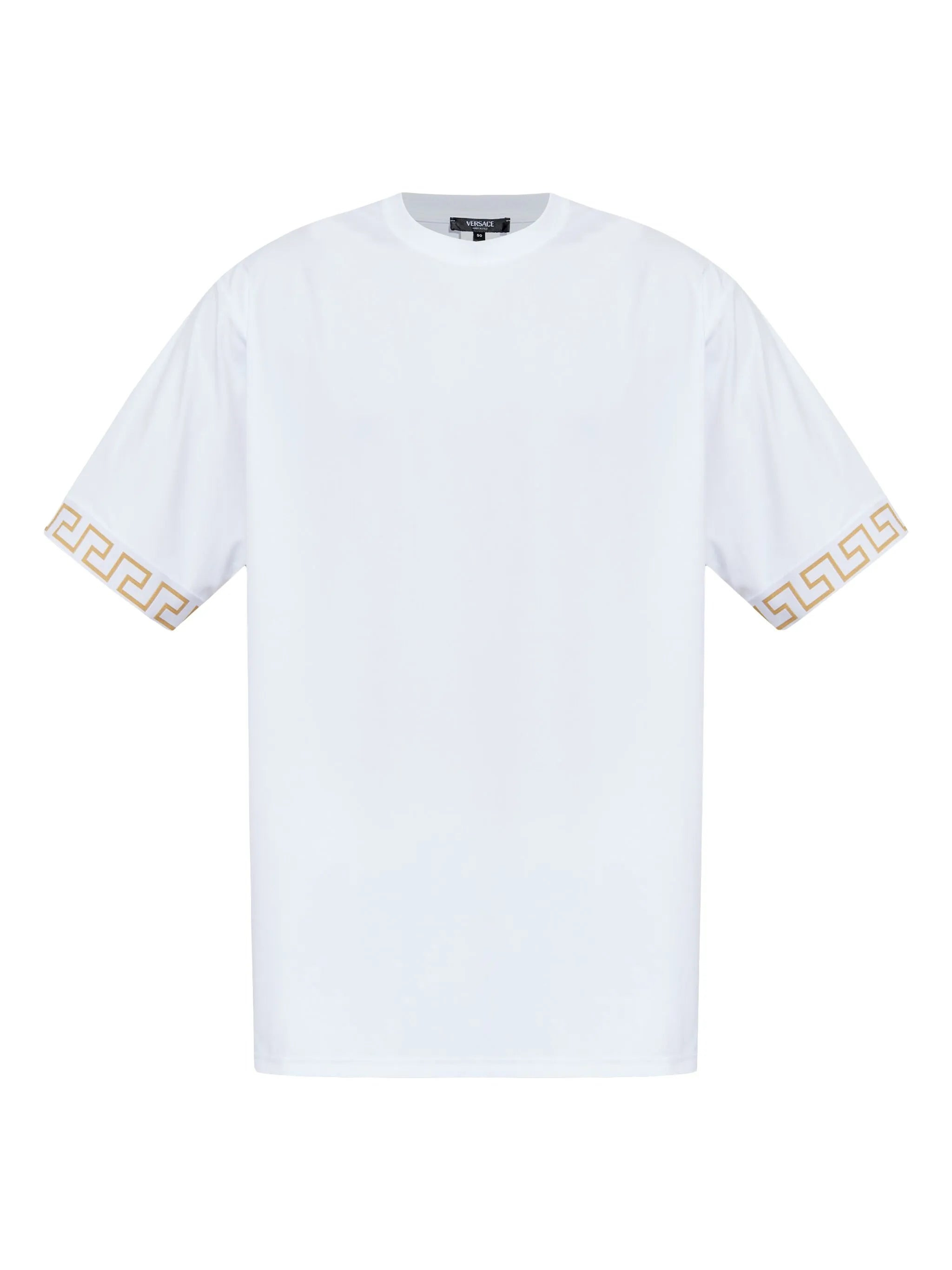 - white - short sleeves - gold-tone Greca detailing - relaxed fit - crew neckline - soft drape Materials & Product Care Polyamide 78%, Spandex/Elastane 22% Size & Fit - Designed for an oversized fit, offering additional room throughout - Made from a midweight stretch fabric, this piece offers elasticity and flexibility when worn