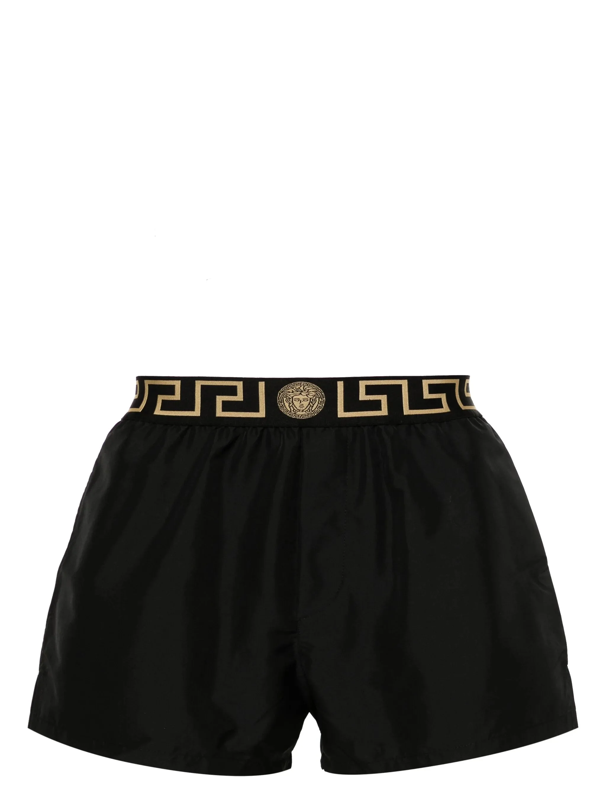 - black/gold-tone - lightweight - elasticated logo waistband with signature Greca detailing and Medusa Head motif - two side inset pockets - full lining - slip-on style - Be mindful to try on swimwear over your own garments. Materials & Product Care Lining: Elastane 6%, Polyester 94% Outer: Polyester 100%