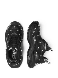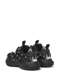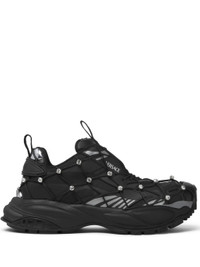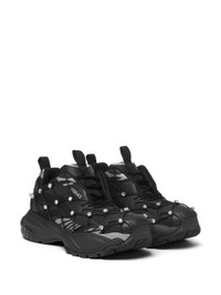 - black - faux leather - panelled design - mesh panelling - crystal embellishment - logo print to the side - signature Greca detailing - round toe - front lace-up fastening - double pull-tab at the opening - EVA midsole - branded insole - chunky rubber lug sole Materials & Product Care Leather 100%