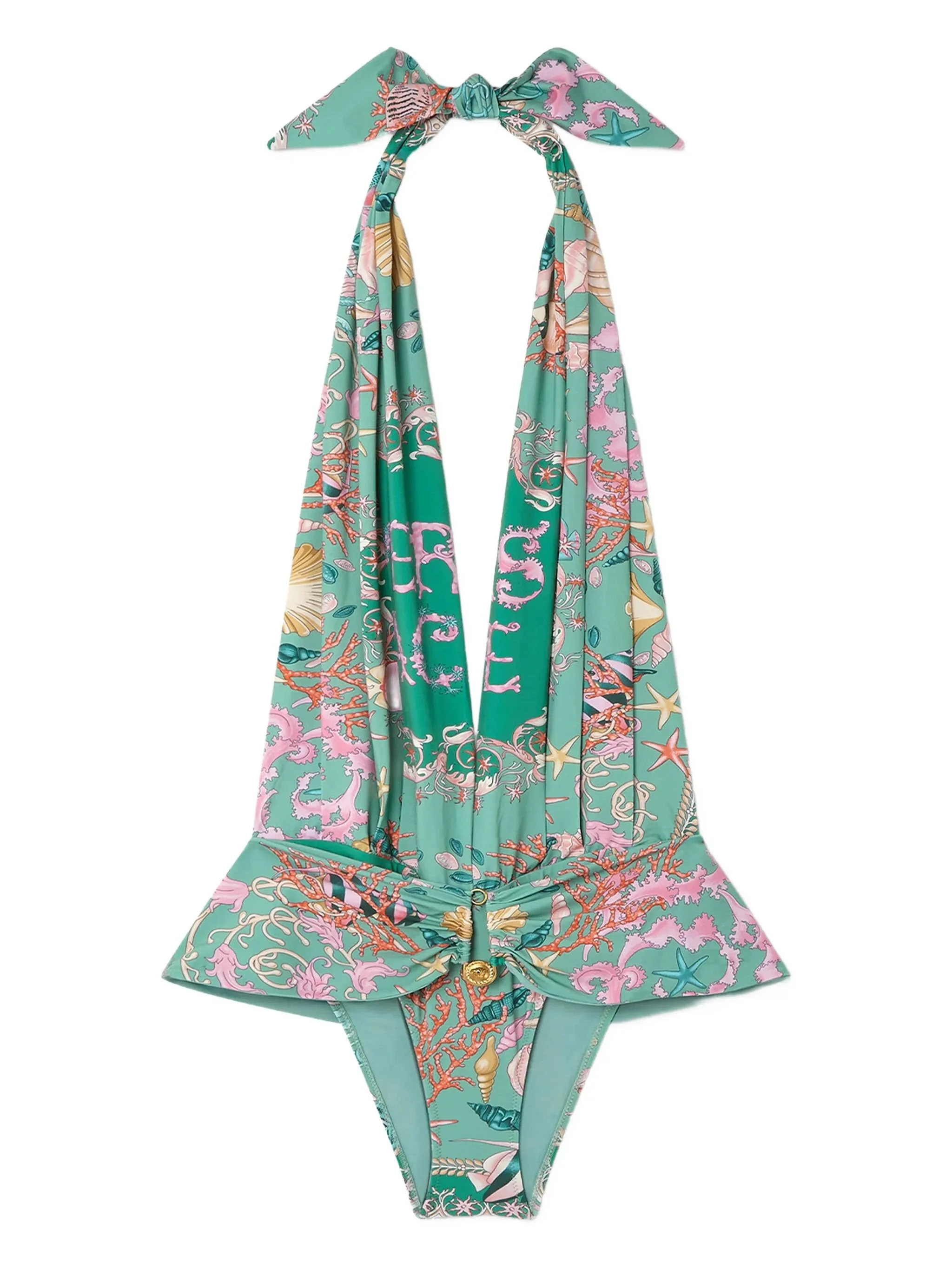 - sea green - halterneck tie fastening - signature Barocco print - signature Medusa Safety Pin detail - plunging V-neck - open back - Be mindful to try on swimwear over your own garments. Materials & Product Care Lining: Polyester 88%, Spandex/Elastane 12% Outer: Polyamide 90%, Spandex/Elastane 10%