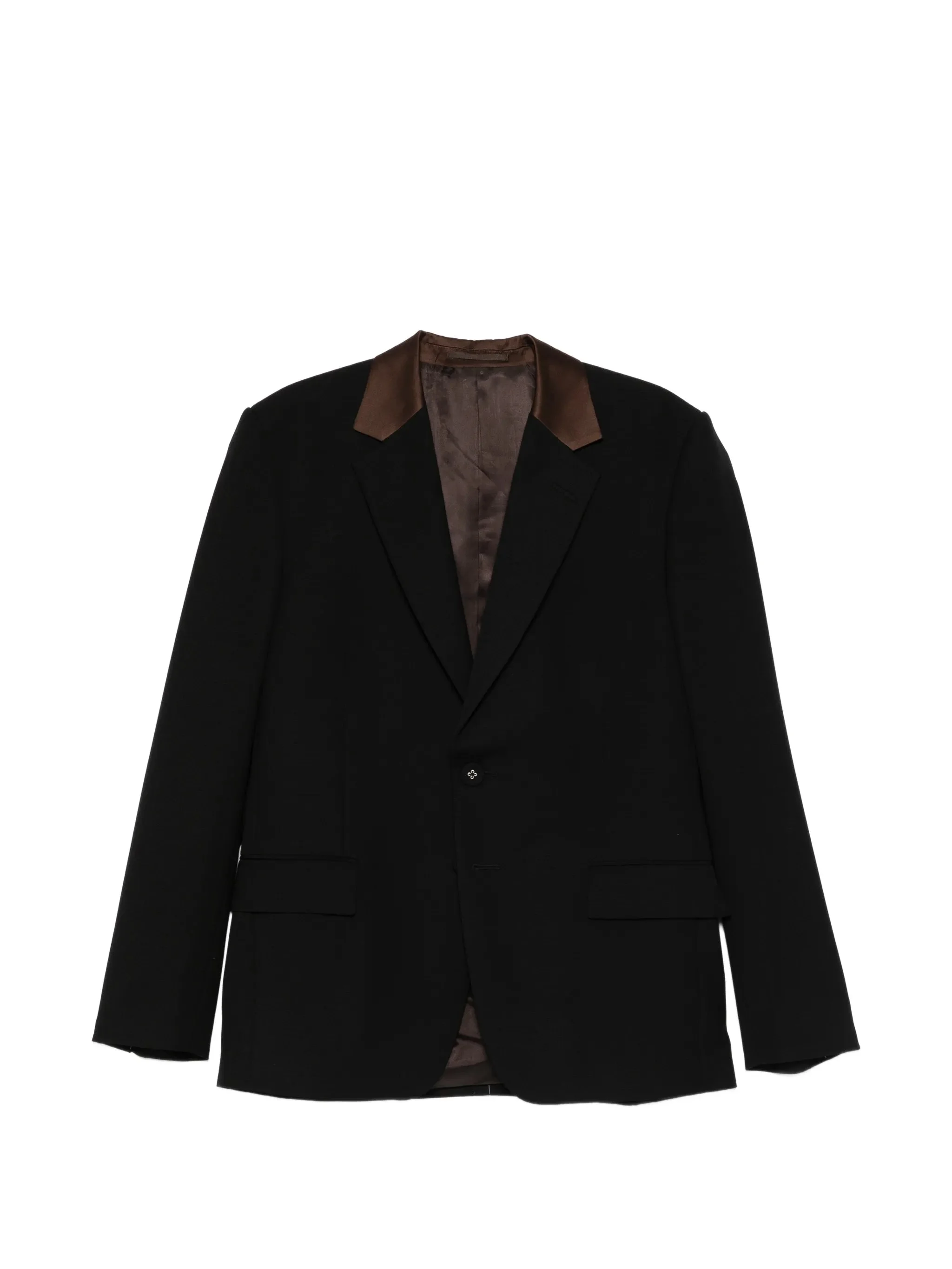 - black - brown satin collar - button fastening - front flap pockets Materials & Product Care Lining: viscose 100% Outer: Polyester 100%, Virgin Wool 100% Size & Fit - The model is 1.87 m wearing size 48.