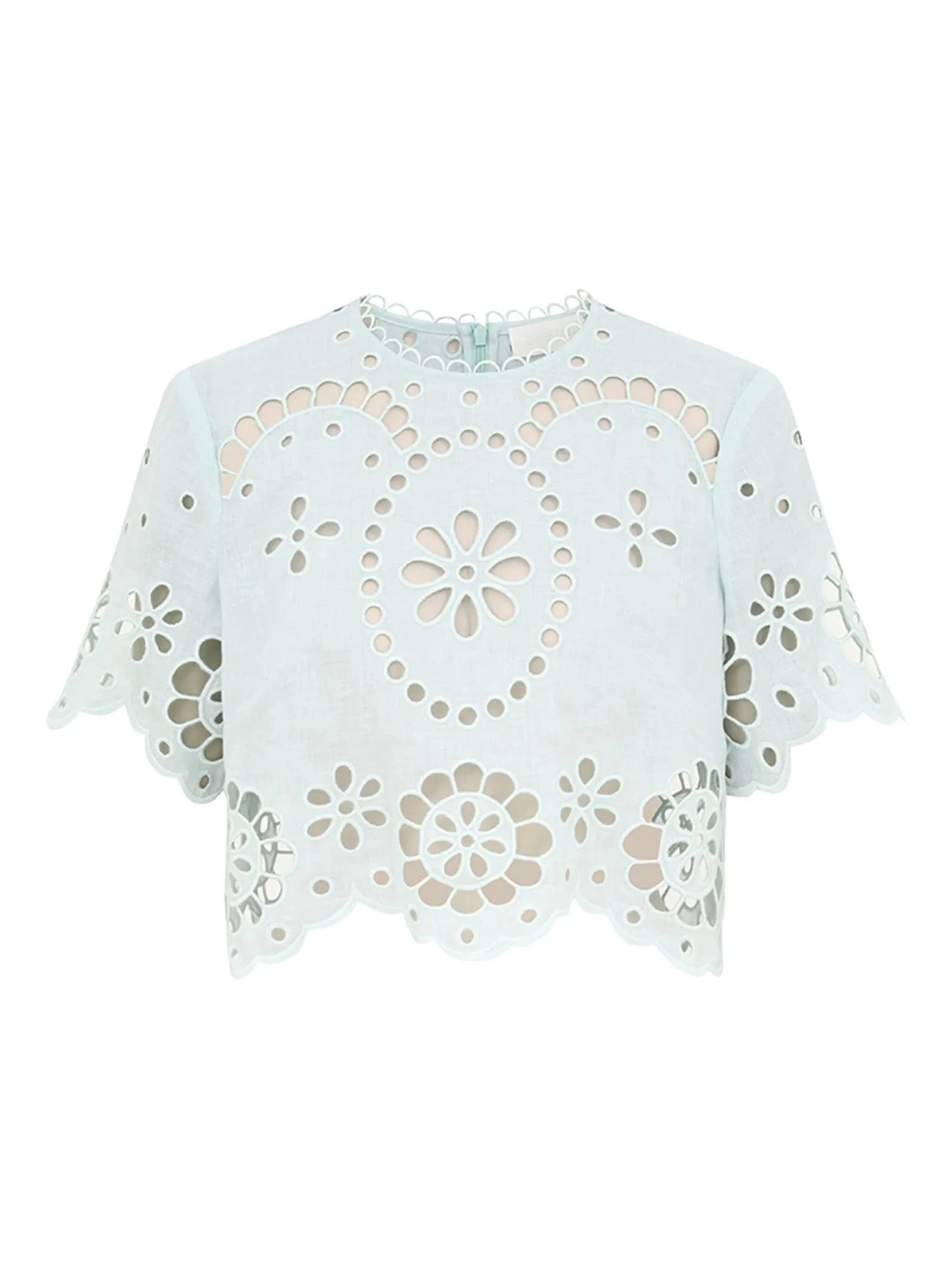 - blue - floral embroidery - scalloped hem - round neck - short sleeves - zip fastening Materials & Product Care Linen/Flax 100%, Polyester 100%