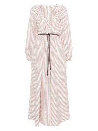 - almond beige - belted waist - U-neck - vertical stripe pattern - long sleeves Materials & Product Care Linen/Flax 100% Size & Fit - Designed to be unstructured, offering a loose fit throughout - Made from a midweight non-stretch fabric, this piece offers minimal elasticity when worn - The adjustable tie waist gives a more adaptable and personalised fit - The model is 1.78 m wearing size 1.