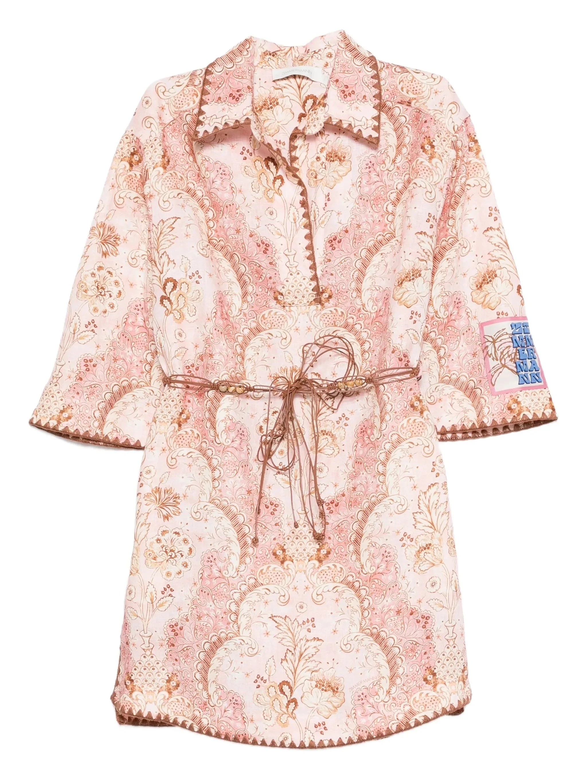 - pink - floral print - collared - three-quarter sleeves - self-tie belt - scalloped hem Materials & Product Care Lining: Cotton 100% Outer: Linen/Flax 100%