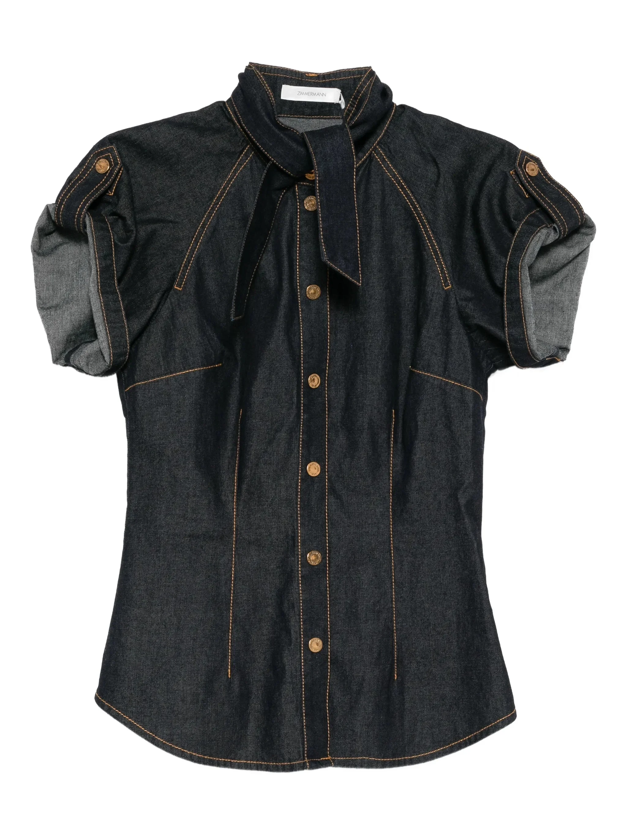 - night sky - press-stud fastening - gold-tone buttons - tie detail - short sleeves - contrast stitching - fitted silhouette Materials & Product Care Cotton 100% Size & Fit - Designed for a slim fit that sits just away from the body offering a close yet comfortable fit - Sturdy and hard-wearing, this denim piece offers no stretch - The dart stitching adds structure and a closer fit in the torso of this piece - The model is 1.77 m wearing size 1.