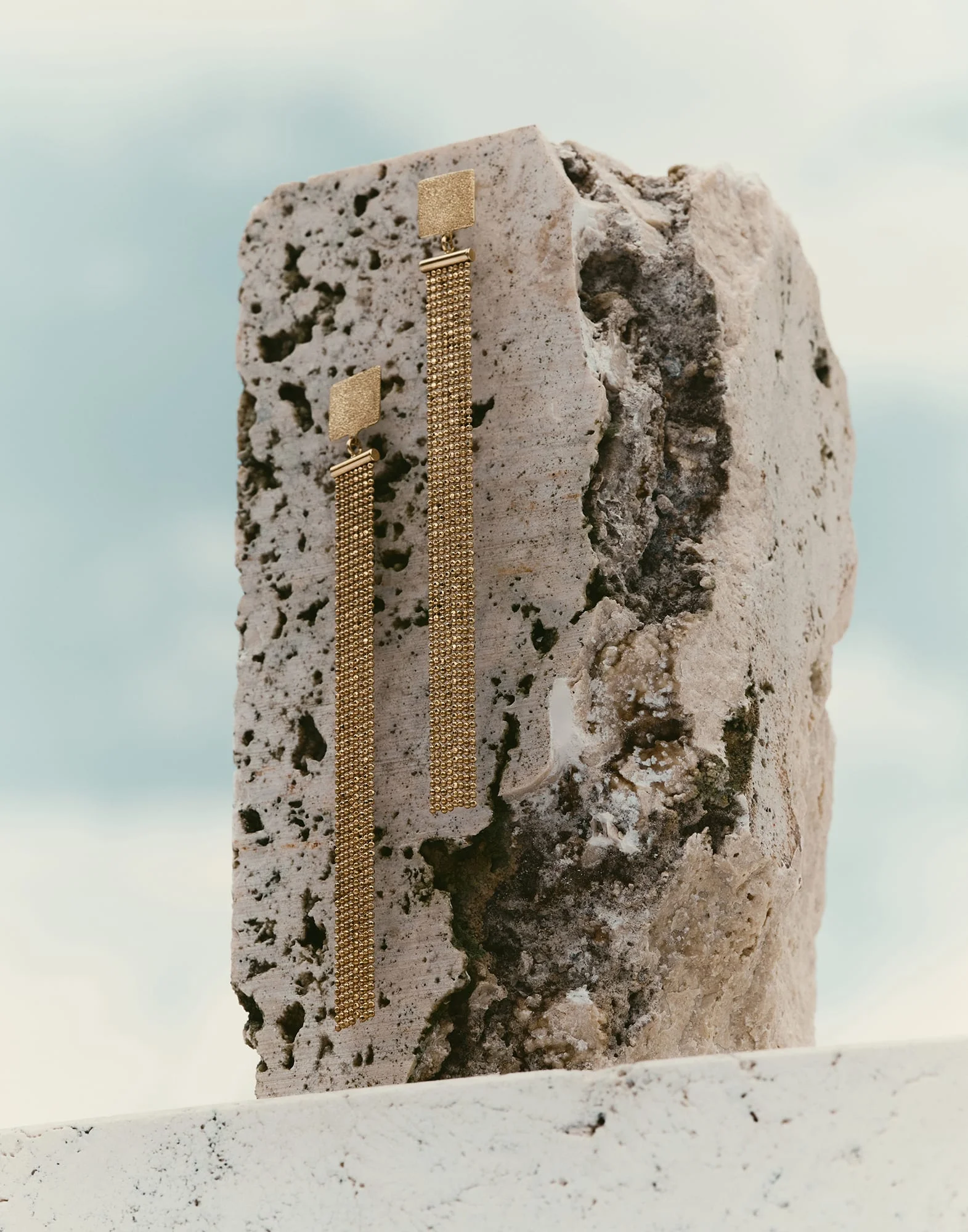 The 18K yellow Gold earrings uses fine cascading rows of monili which shine with a multitude of reflections with each step. Furthermore, the jewelry’s base is finished with mirror polishing: an artisanal technique that engraves the surface with a special bit to accentuate the Gold’s sparkle. MATERIALS The 18K yellow Gold jewelry was designed and handcrafted in Umbria, the Italian region that is home to the village of Solomeo. Fine rows of 18K yellow Gold monili represent the iconic element of the Brunello Cucinelli collections: each row is made up of small rounded beads with a faceted effect. DETAILS Friction fastening The length of the earrings is approximately 10 cm (3.94") The jewel is entirely made from 18 kt yellow gold Designed and Made in Italy Jewels come with a special packaging dedicated to the Aurum line 18K YELLOW GOLD
