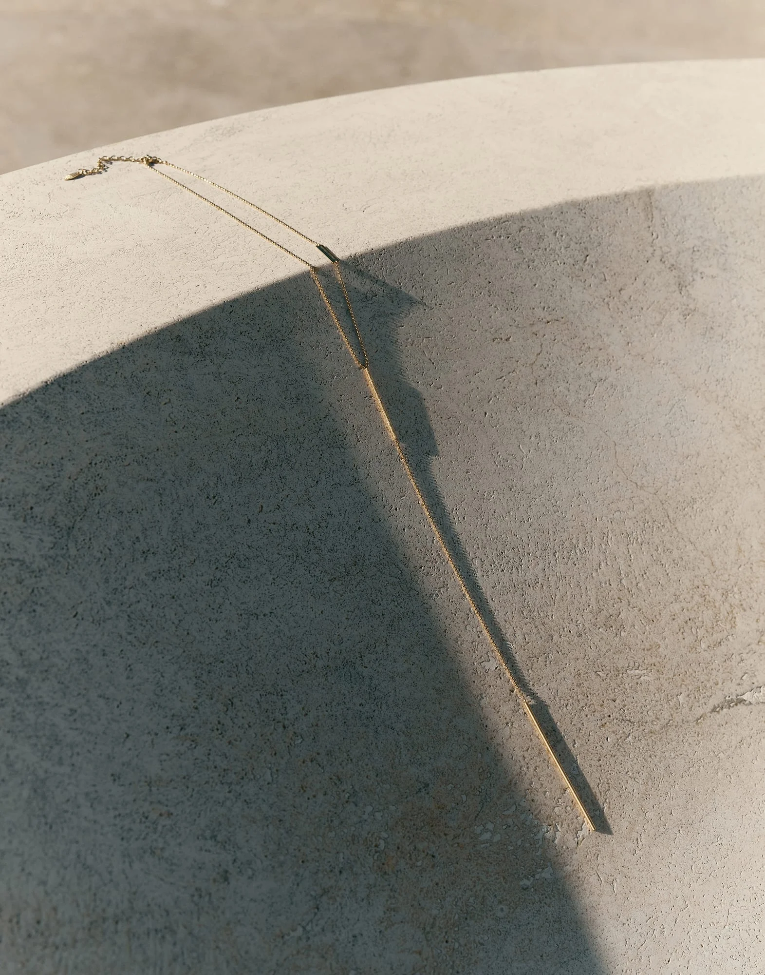 The delicate and pure shapes of the 18K yellow Gold necklace perfectly embody the spirit of the Aurum line: refined jewelry that enhances the Gold’s natural splendor thanks to a simple and essential design. Two small elongated pendants are finished with mirror polishing, a technique that engraves the surface with a special bit to accentuate the Gold’s shiny reflections. Set in the clasp, a round 0.015ct Diamond completes the jewelry with an “invisible” detail of sophistication. MATERIALS The 18K yellow Gold jewelry was designed and handcrafted in Umbria, the Italian region that is home to the hamlet of Solomeo. The 0.015ct Diamond which embellishes the clasp is a round cut. A fine row of 18K yellow Gold monili represents the iconic element of the Brunello Cucinelli collections and is made up of small rounded beads with a faceted effect. DETAILS The jewel is entirely made from 18 kt yellow gold Adjustable length closure clasp A 0.015 ct round brilliant cut diamond embellishes the closure clasp The maximum length of the necklace is approximately 44 cm (17.32") Designed and Made in Italy Jewels come with a special packaging dedicated to the Aurum line 18K YELLOW GOLD