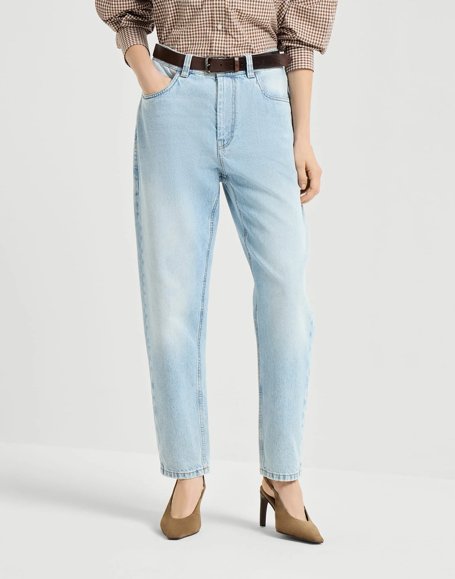 Relaxed volumes and straight lines define the informal attitude of the Baggy Tapered trousers. The soft, substantial feel of pure cotton Authentic denim enhances the casual silhouette of the trousers, which features a leg that tapers slightly at the bottom. MATERIALS The new Authentic cotton fabric maintains the characteristically full, even texture of denim, but is also pleasantly soft and comfortable to wear. The lived-in look and special nuanced effect of the color have been created thanks to various dyes and washes. As a result, its hue may evolve and naturally lighten with washing and daily use, refined traits of the fabric itself. DETAILS Zip closure with button Front pockets with watch pocket Back patch pockets 100% COTTON