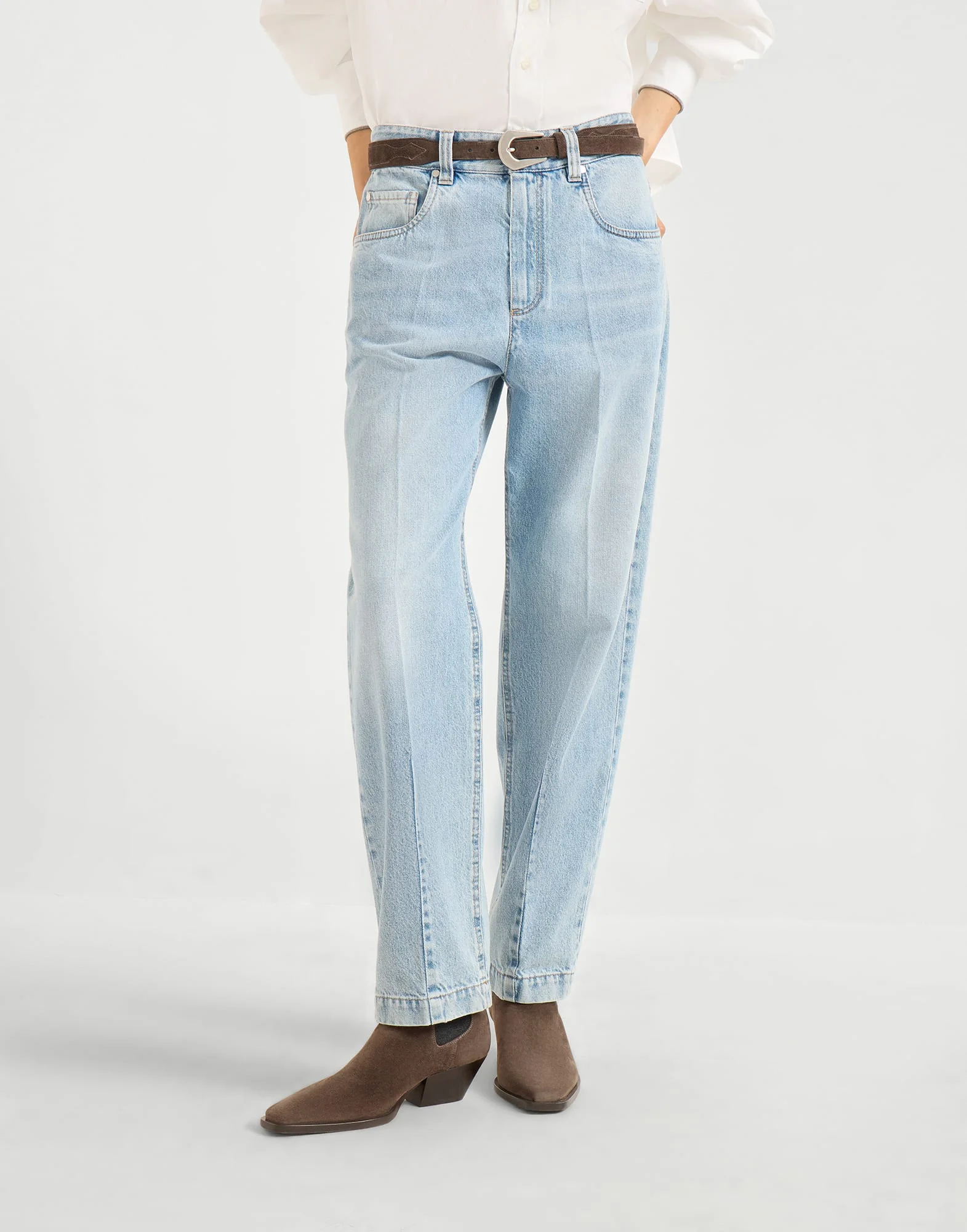 Casual style and refined details define these new Authentic denim Loose trousers. The straight, relaxed and wide cut pairs perfectly with the fabric’s slightly “vintage” look, characterized by its faded, worn color. MATERIALS The new Authentic cotton fabric maintains the characteristically full, even texture of denim, but is also pleasantly soft and comfortable to wear. The lived-in look and special nuanced effect of the color have been created thanks to various dyes and washes. As a result, its hue may evolve and naturally lighten with washing and daily use, refined traits of the fabric itself. DETAILS Zip closure with button Front pockets with watch pocket Back patch pockets 100% COTTON