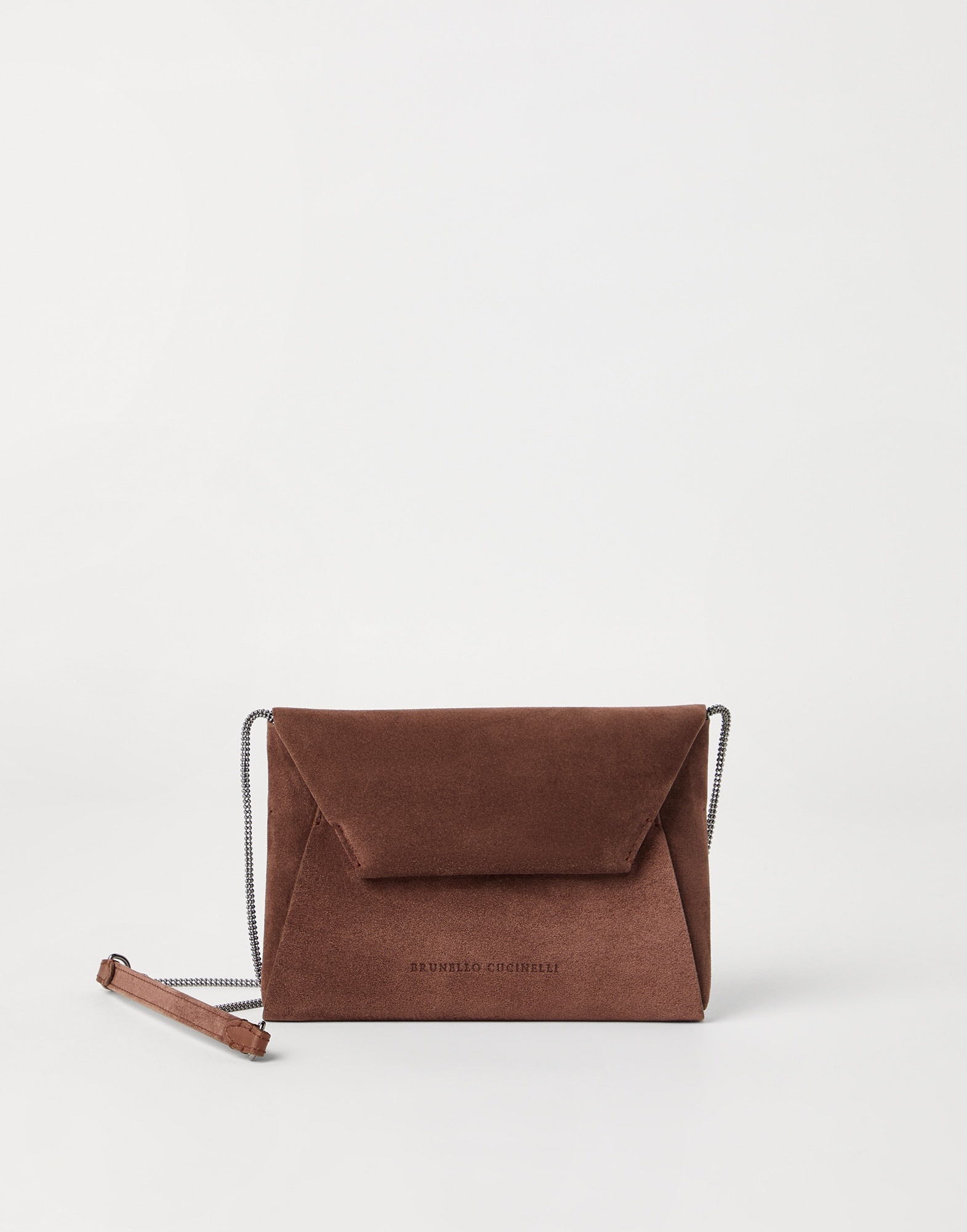 An elegant, extremely feminine aesthetic is paired with Brunello Cucinelli’s refined materials and sparkling details in this suede BC Duo clutch. The silhouette is reminiscent of a classic letter envelope and is highlighted by the sophisticated, velvety leather. To embellish the design, four rows of shiny monili create the shoulder strap that can be removed, allowing the clutch to be carried in hand, for countless styling options. MATERIALS Refined suede is a thin leather with a soft, velvety hand. DETAILS Magnetic snap closure Shoulder strap Leather lining 1 slot for cards and business cards Nickel-free monili decoration Accessory is approx. 21 cm (8.27") long, 14.5 cm (5.71") high, and 2 cm (0.79") wide 100% REAL LEATHER