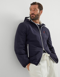 Refined materials enrich the sporty style of the Travelwear line, dedicated to moments of relaxation and leisure. This hooded jacket is practical and functional thanks to the unique features of the technical nylon fabric: smooth and luminous on the outside to enhance the refined seasonal nuances, while, on the inside, it integrates a protective membrane that shields from water and wind. The comfortable and regular fit is complemented by the Thermore® padding and by the iconic logo detail on the chest. MATERIALS Nylon is a lightweight fabric equipped with a thin inner membrane that improves weather-resistance without compromising breathability. A small percentage of stretch fiber provides added comfort, while the lightweight Thermore® padding ensures a balanced weight without compromising adequate protection. DETAILS Two-way zip closure Lined hood and adjustable drawstring Hand pockets with zipper Cased elastic at cuffs and waistband Lined Thermore® padding 83% NYLON, 17% ELASTANE
