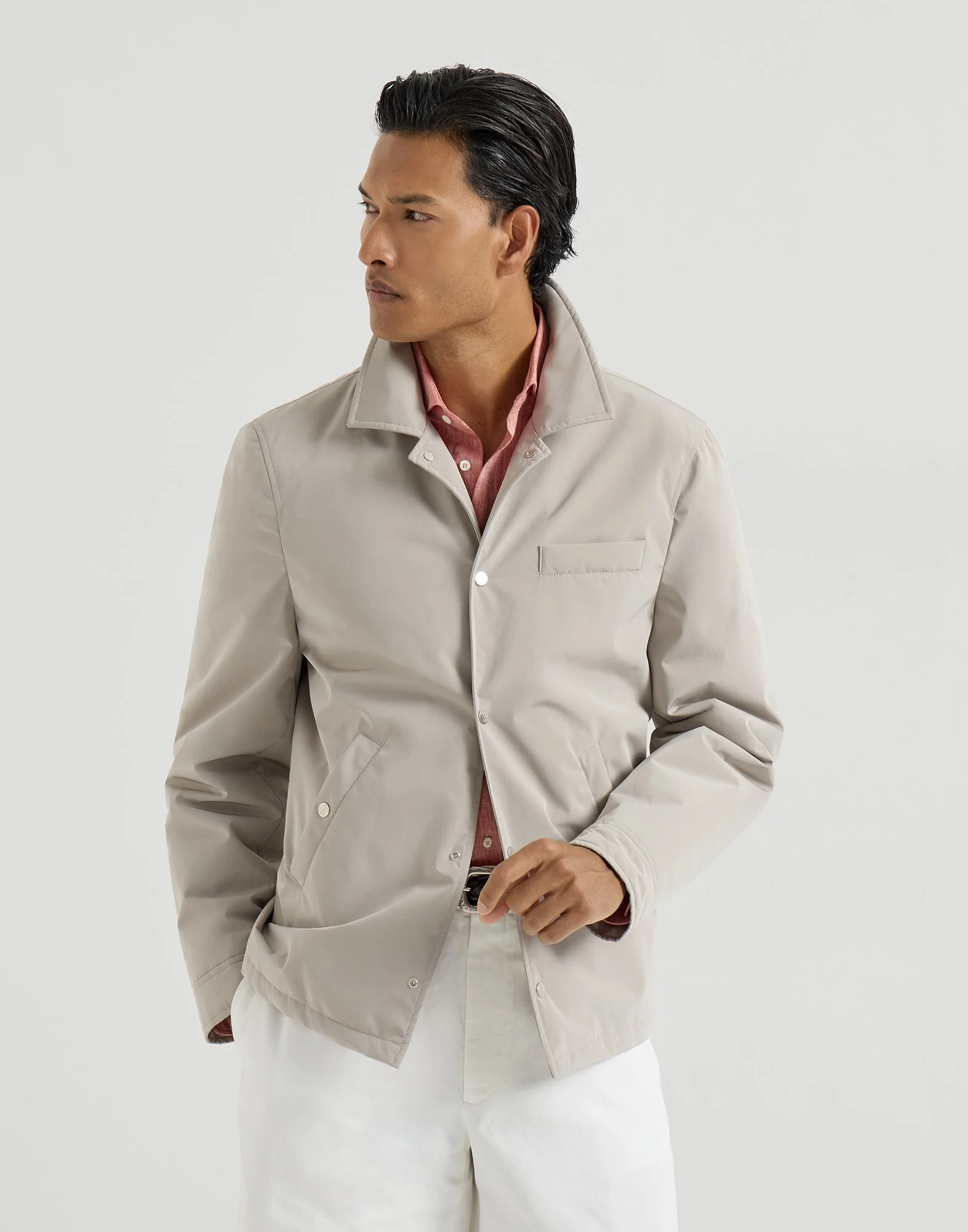 This padded nylon outerwear jacket combines a versatile, essential silhouette with functional materials and finishes, conveying a contemporary vision of menswear. The fabric’s fluid, lightweight hand is completed by the inner membrane, which together with a thin layer of Thermore® padding, ensures protection and warmth. The shirt-style silhouette features regular, comfortable proportions. MATERIALS Nylon is a lightweight fabric, equipped with a thin inner membrane that heightens weather-resistance while maintaining excellent breathability. The Thermore® padding, a high-quality technical material, ensures lightness without compromising proper protection. DETAILS Snap closure Shirt-style collar Chest pocket Vertical hand pockets Water-resistant nylon lining Two interior pockets with button closure and pen holder Thermore® padding 70% POLYESTER, 30% NYLON