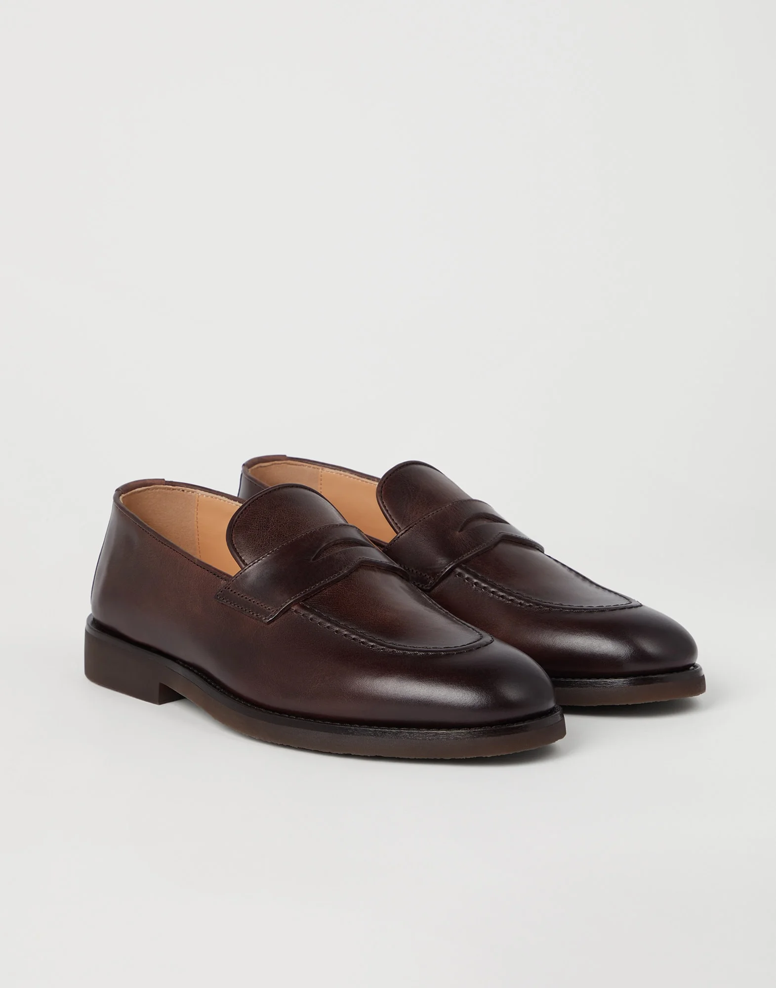 Casual lines and refined materials define the style of these calfskin Penny Loafers. Thanks to special finishing, the luxurious leather accentuates the season’s colors with slight color effects and a subtle natural grain. A rubber tread provides added comfort. MATERIALS Lightweight and soft, the calfskin showcases a slight natural grain that brings out the season’s colors. The finish and special coloring give the leather a mild light and dark effect with a vintage feel, resulting in unique shading and details in each style. The leather outsole is completed with a rubber tread that ensures comfort. DETAILS Leather lining Leather sole TPU rubber tread REAL LEATHER
