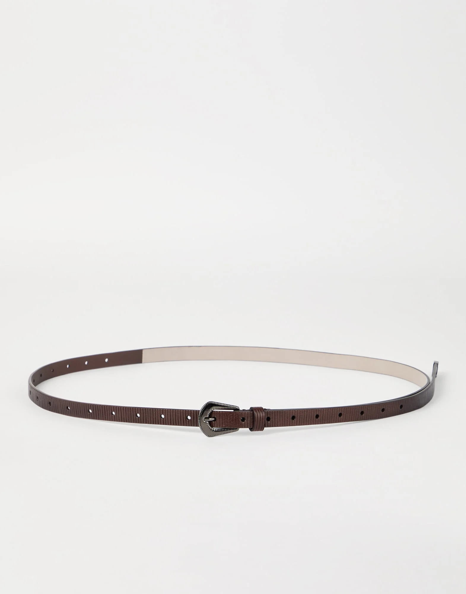 The special irregular, semi-polished effect of carved leather gives this belt a unique, elegant appearance. The design pairs sophistication and craftsmanship, allowing it to complete any outfit with a distinctive touch. MATERIALS The refined leather is finished to showcase a slightly irregular and polished carved effect. DETAILS Belt height approx. 1 cm (0.39") All metal parts are Nickel-free REAL LEATHER