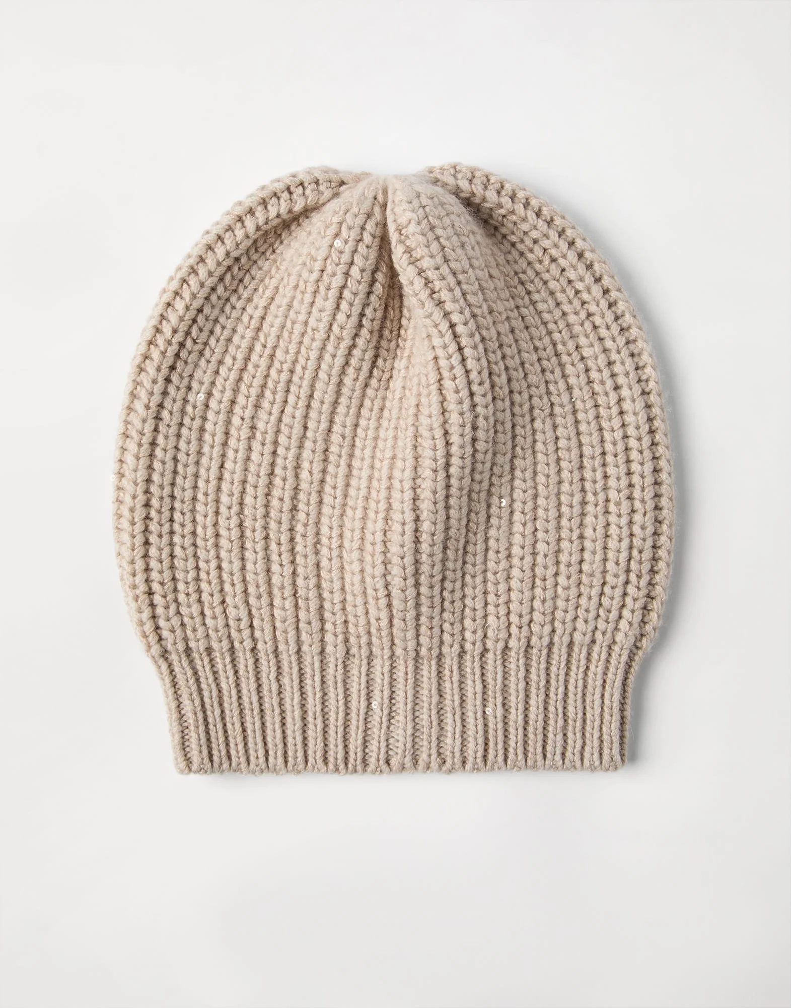 Precious Brunello Cucinelli materials enrich the new beanie. The vaporous texture of the cashmere and silk Diamond yarn enhances the accessory with a precious all-over luminous effect created by the small paillettes inserted into the yarn. MATERIALS The accessory combines the soft, flowing cashmere Feather yarn with the precious cashmere and silk Diamond yarn, characterized by small paillettes that enrich the texture with intense bright reflections. DETAILS Plain stitch 90% CASHMERE, 10% SILK