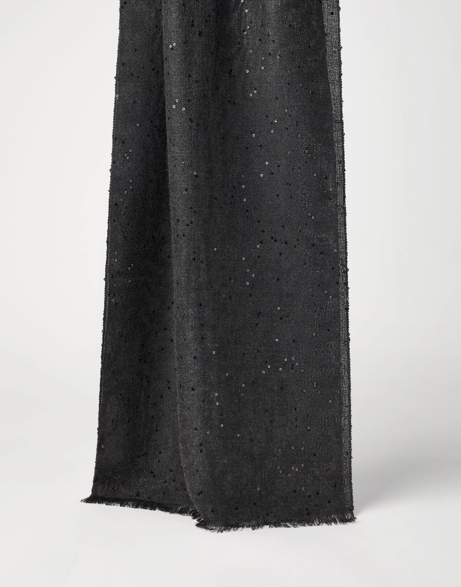 The excellence of Brunello Cucinelli materials and craftsmanship elevate the style of this scarf with a sophisticated touch. Small paillettes enrich the cashmere and silk Diamond yarn’s soft and lightweight texture with precious sparkling reflections. MATERIALS An iconic material of the Brunello Cucinelli collections, Diamond yarn combines the soft, enveloping effects of noble cashmere and silk fibers with sparkling reflections spread by small paillettes incorporated into the yarn. DETAILS Scarf measures approx. 70 cm (27,56") x 200 cm (78,74") 70% CASHMERE, 30% SILK
