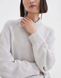 Refined Brunello Cucinelli materials enrich the relaxed feel of this cashmere and silk diamond yarn sweater. The yarn combines the extremely soft texture of the natural fibers with the sparking touch of the small sequins embedded into the yarn, spreading delicate reflections throughout the garment’s entire surface. The silhouette features comfortable proportions, completed by a classic crew-neck and slightly dropped shoulders. MATERIALS Manufacturing of the cashmere and Diamond silk yarn combines the refined qualities of the natural fibers with intense reflections spread by small paillettes incorporated into the yarn. DETAILS Crew-neck Drop shoulder Raglan shoulder with wide sleeve Plain stitch 80% CASHMERE, 20% SILK