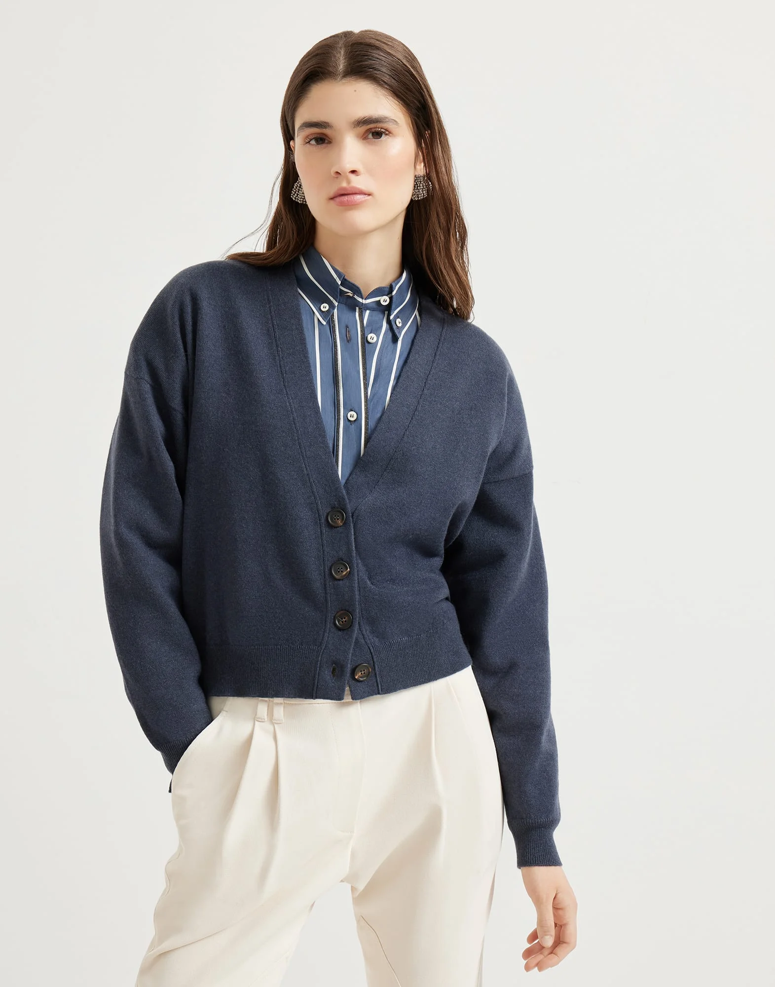 The timeless feel of this cashmere cardigan is paired with the elegant and precious touch of the iconic embellishment of the Brunello Cucinelli Womenswear collections. A shiny monili embroidery creates a line behind the neck, adding an unexpected sparkle to this piece. The horn buttons and the rib knit bottom band and cuffs complete this sweater with comfortable, sophisticated style. MATERIALS The noble cashmere fiber is characterized by an extreme fineness and also for its precious insulating qualities which guarantee warmth, providing coverage and lightness when worn. DETAILS Horn button closure Drop shoulder Plain stitch Nickel-free monili decoration 100% CASHMERE