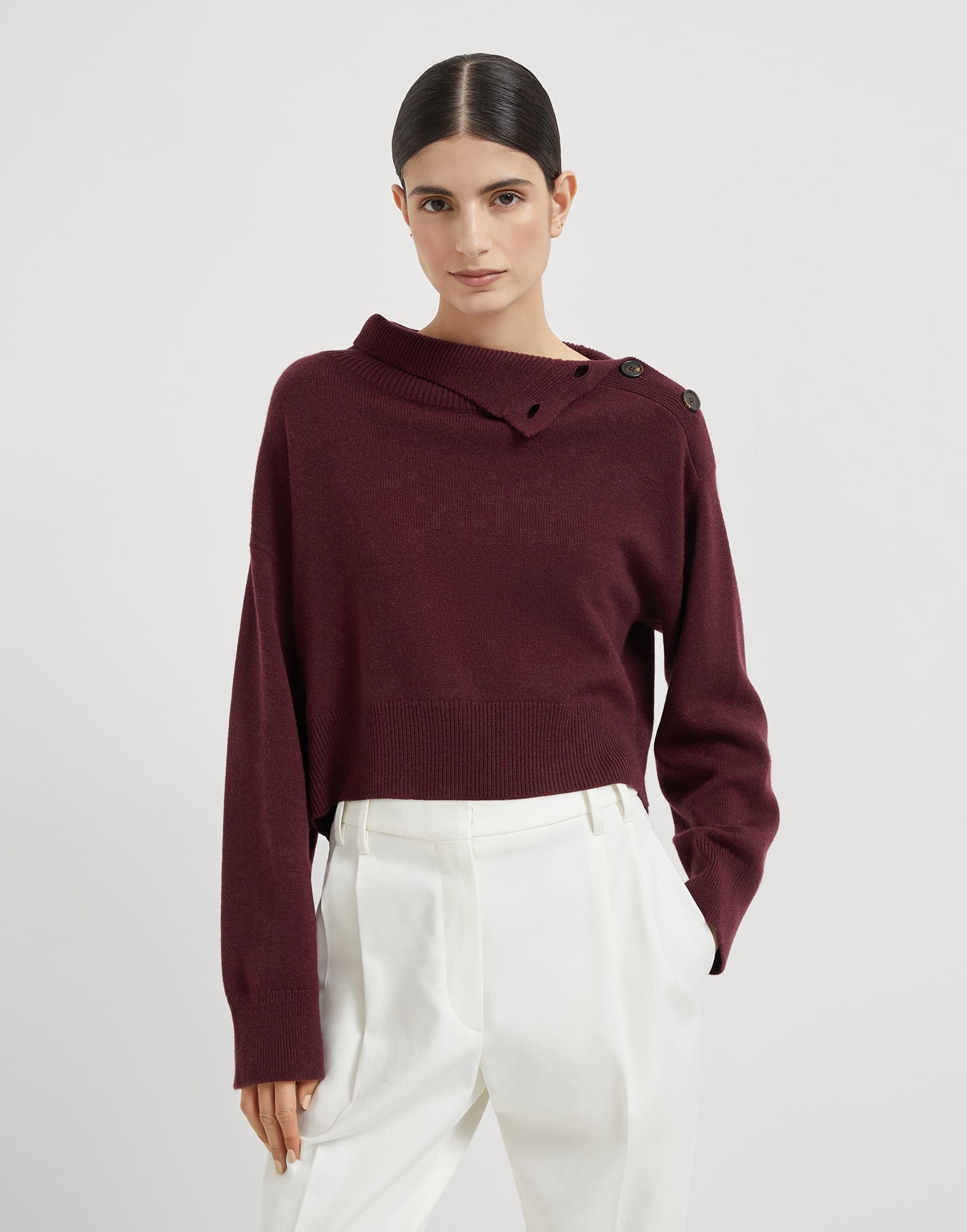 Cozy cashmere and precious details are the highlights of this cropped turtleneck sweater. Featuring a cropped cut and relaxed volume, the style stands out for its informal attitude, elevated by the refined fibers of the softest cashmere. The button opening detail on the collar provides a contemporary feel, while the shiny monili embroidery, Brunello Cucinelli’s iconic embellishment, adds a delicate feminine sparkle. MATERIALS The noble cashmere fiber is characterized by an extreme fineness and also for its precious insulating qualities which guarantee warmth, providing coverage and lightness when worn. DETAILS High collar with opening Drop shoulder Wide sleeve Plain stitch Nickel-free monili decoration 100% CASHMERE