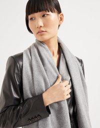 The unmistakable double knit from the Brunello Cucinelli collections enhances the essential style of this scarf with its finesse. The noble yarn’s ultra-soft, compact texture enriches the season's colors, giving the accessory an understated elegance. MATERIALS Two thin layers of cashmere fabric are crafted together through a complex manual process combined with machine work. Ultra-soft and cozy, the accessory maintains a balanced weight to offer the right amount of protection. DETAILS Short side with fringe Special workmanship Scarf measures approx. 40 cm (15,75") x 200 cm (78,74") 100% CASHMERE