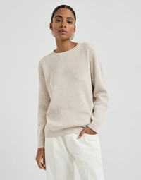 Cozy and timeless style characterizes this new cashmere sweater. Its English rib knitting emphasizes the soft, comfortable look of this piece. Behind the neck, a shiny monili embroidery stands out, adding a delicate sparkling note created by a sophisticated embellishment in true Brunello Cucinelli style. MATERIALS The noble cashmere fiber is characterized by an extreme fineness and also for its precious insulating qualities which guarantee warmth, providing coverage and lightness when worn. DETAILS Crew-neck Drop shoulder English rib Nickel-free monili decoration 100% CASHMERE