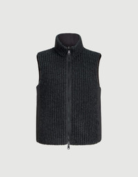 Precious materials and details enhance the sporty and versatile flavor of the down vest. The reversibility makes the garment functional and makes the most of the materials: on the exterior, English Rib knit soft cashmere Feather yarn is paired with the lightweight taffeta back. The interior showcases lightweight nylon. Along the zipper closure, fine rows of monili embroidery enriches the garment with a shiny touch. MATERIALS The lightweight pure cashmere Feather yarn is characterized by an extremely soft hand. A compact and voluminous texture makes the yarn warm and cozy. The reversible side showcases lightweight nylon: a finish provides added resistance to the slightest contact with water. DETAILS Two-way zip closure High collar Hand pockets with snap *Reversible side* Water-resistant nylon lining Thermore® padding Nickel-free monili decoration 100% CASHMERE