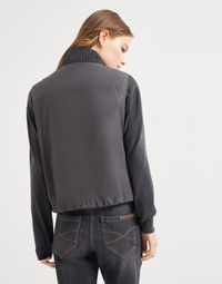 Precious materials and details enhance the sporty and versatile flavor of the down vest. The reversibility makes the garment functional and makes the most of the materials: on the exterior, English Rib knit soft cashmere Feather yarn is paired with the lightweight taffeta back. The interior showcases lightweight nylon. Along the zipper closure, fine rows of monili embroidery enriches the garment with a shiny touch. MATERIALS The lightweight pure cashmere Feather yarn is characterized by an extremely soft hand. A compact and voluminous texture makes the yarn warm and cozy. The reversible side showcases lightweight nylon: a finish provides added resistance to the slightest contact with water. DETAILS Two-way zip closure High collar Hand pockets with snap *Reversible side* Water-resistant nylon lining Thermore® padding Nickel-free monili decoration 100% CASHMERE