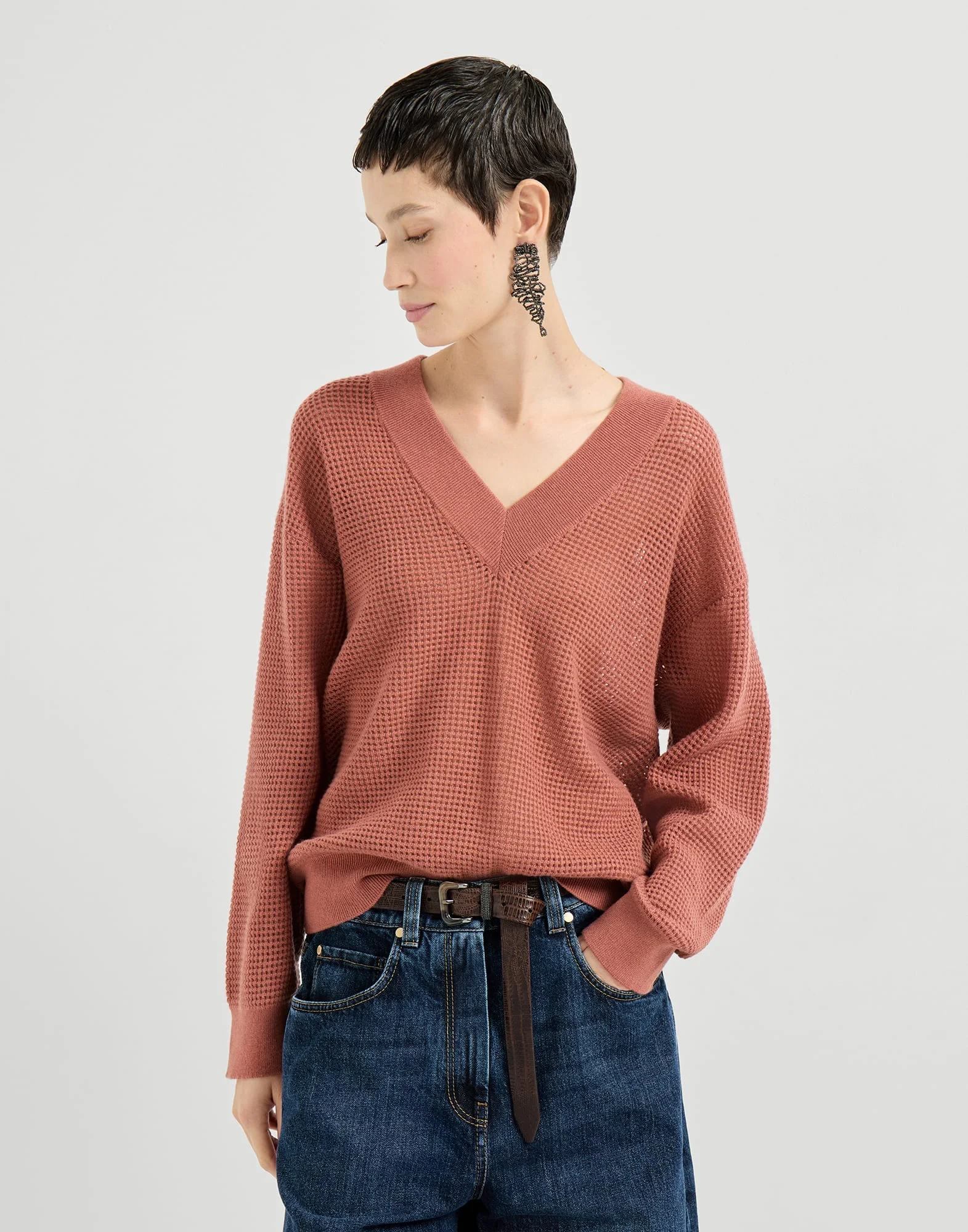 Lightness, airiness and softness define the style of this cashmere net sweater. The natural yarn is crafted with a net-like stitch, creating an elegant interplay of openwork and solid textures. The comfortable, relaxed silhouette is emphasized by the dropped shoulders and wide sleeves, and is completed by a very feminine V-neck. MATERIALS The noble cashmere fiber is characterized by an extreme fineness and also for its precious insulating qualities which guarantee warmth, providing coverage and lightness when worn. DETAILS Rib knit V-neck Drop shoulder Rib knit cuffs and bottom band Net knitting 100% CASHMERE