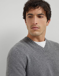 The iconic yarn of the Brunello Cucinelli collections enriches the essential, timeless look of this pure cashmere sweater. The rib knit edges of the V-neck, cuffs and bottom band give the garment a sporty touch. The fit offers regular proportions both in the chest and the sleeves. MATERIALS The noble cashmere fiber is characterized by an extreme fineness and also for its precious insulating qualities which guarantee warmth, providing coverage and lightness when worn. DETAILS Rib knit V-neck Rib knit cuffs and bottom band Plain stitch 100% CASHMERE