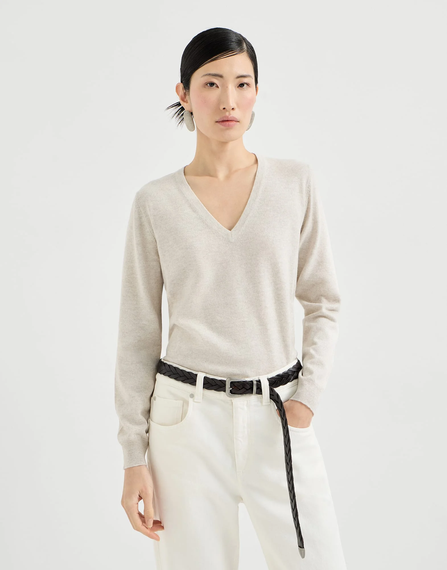The excellence of knitwear is combined with refined details in true Brunello Cucinelli style to enrich the essential lines of this V-neck sweater. The smooth, soft pure cashmere texture is illuminated behind the neck with a shiny monili embroidery that adds a precious sparkling note. MATERIALS The noble cashmere fiber is characterized by an extreme fineness and also for its precious insulating qualities which guarantee warmth, providing coverage and lightness when worn. DETAILS V-neck Regular sleeve Plain stitch Nickel-free monili decoration 100% CASHMERE