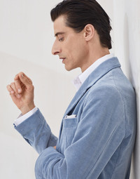 Classic inspiration and contemporary creativity define the refined feel of this deconstructed Cavallo blazer with metal buttons. The fabric’s unmistakable texture comes to life through intense colors and the natural qualities of the comfort cotton and cashmere fibers, for an ideal fit. The “Solomeo Shoulder”, named after the hamlet where the company is located, characterizes the Brunello Cucinelli blazer with signature proportions. The tapered and pronounced cut of the shoulder enhances the male physique without the need for padding. MATERIALS Refined cashmere fibers enrich the traditional texture of cotton corduroy, accentuating its softness, warmth and sheen. The presence of an elastic fiber ensures maximum comfort. The lightweight cupro lining enriches and completes the garment. DETAILS 3-roll-2 closure with metal buttons Notched lapel Welt pockets with flap, ticket pocket with flap and chest pocket Cuffs have four metal buttons and functional buttonholes Half-lined Two interior pockets with button closure and pen holder Drop 7 Double back vent 91% COTTON, 8% CASHMERE, 1% ELASTANE