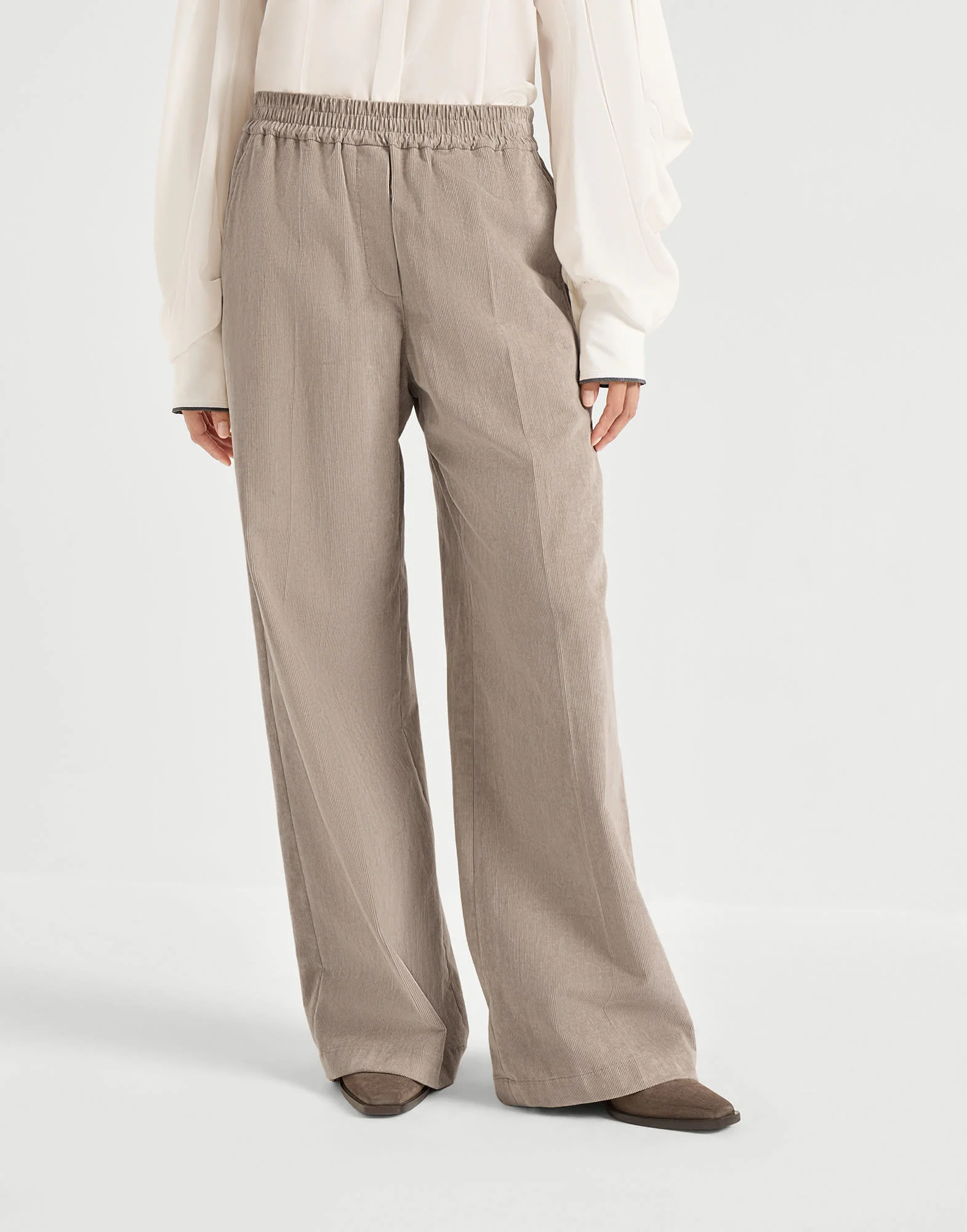 A relaxed feel and informal fabrics define the style of these loose track trousers in comfort cotton narrow wale corduroy. The garment features a comfortable silhouette emphasized by the pull-on fit, with soft, straight proportions down the leg. The narrow wale corduroy gives the trousers a retro look and adds a sophisticated touch of texture. MATERIALS The comfort cotton narrow wale corduroy is characterized by a soft, velvety texture. A small percentage of synthetic fiber provides added comfort. DETAILS Pull-up trousers Front pockets Back patch pockets Lined 99% COTTON, 1% ELASTANE