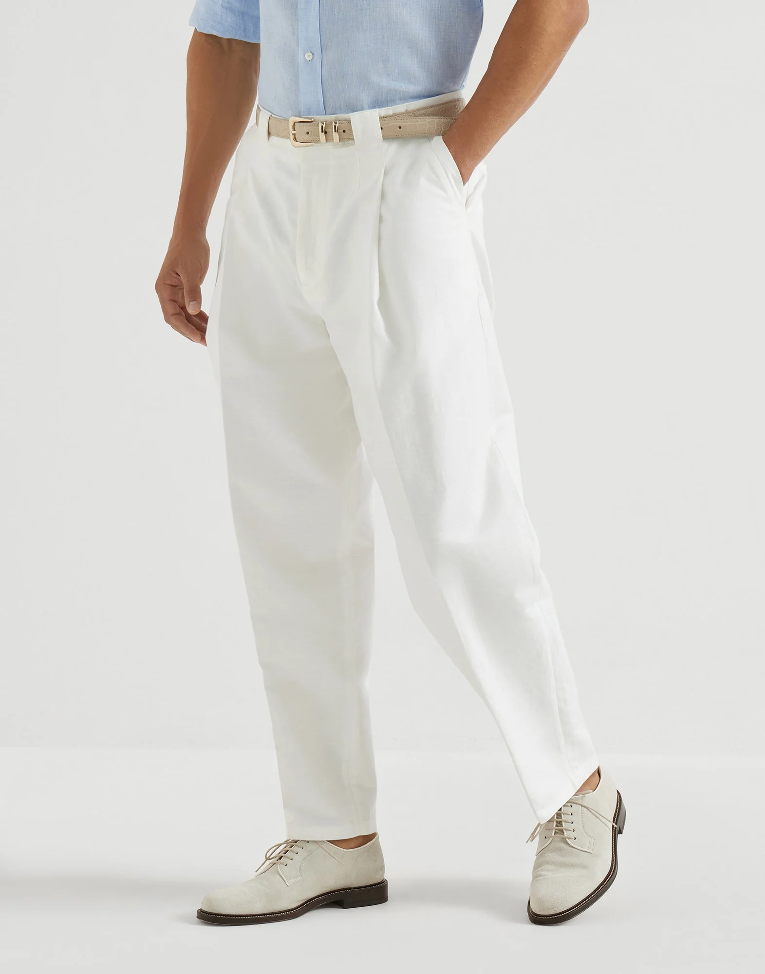 Light and airy, these panama trousers combine refined yarns and workmanship to make wearing feel natural and comfortable. The cotton and linen fibers give the fabric a compact hand and a distinctive irregular coloring. The regular-waisted fit features intentionally soft and wide volume in the leg, defining a contemporary and versatile style. MATERIALS The distinctive basketweave pattern of panama fabric, crafted through a plain weave technique, provides structure and visual depth while blending the soft hand of cotton with the delicate slubbed appearance of linen fibers. DETAILS Zip closure with button and backing button Slanted front pockets Pleat Back welt pockets Plain hem 69% COTTON, 31% LINEN