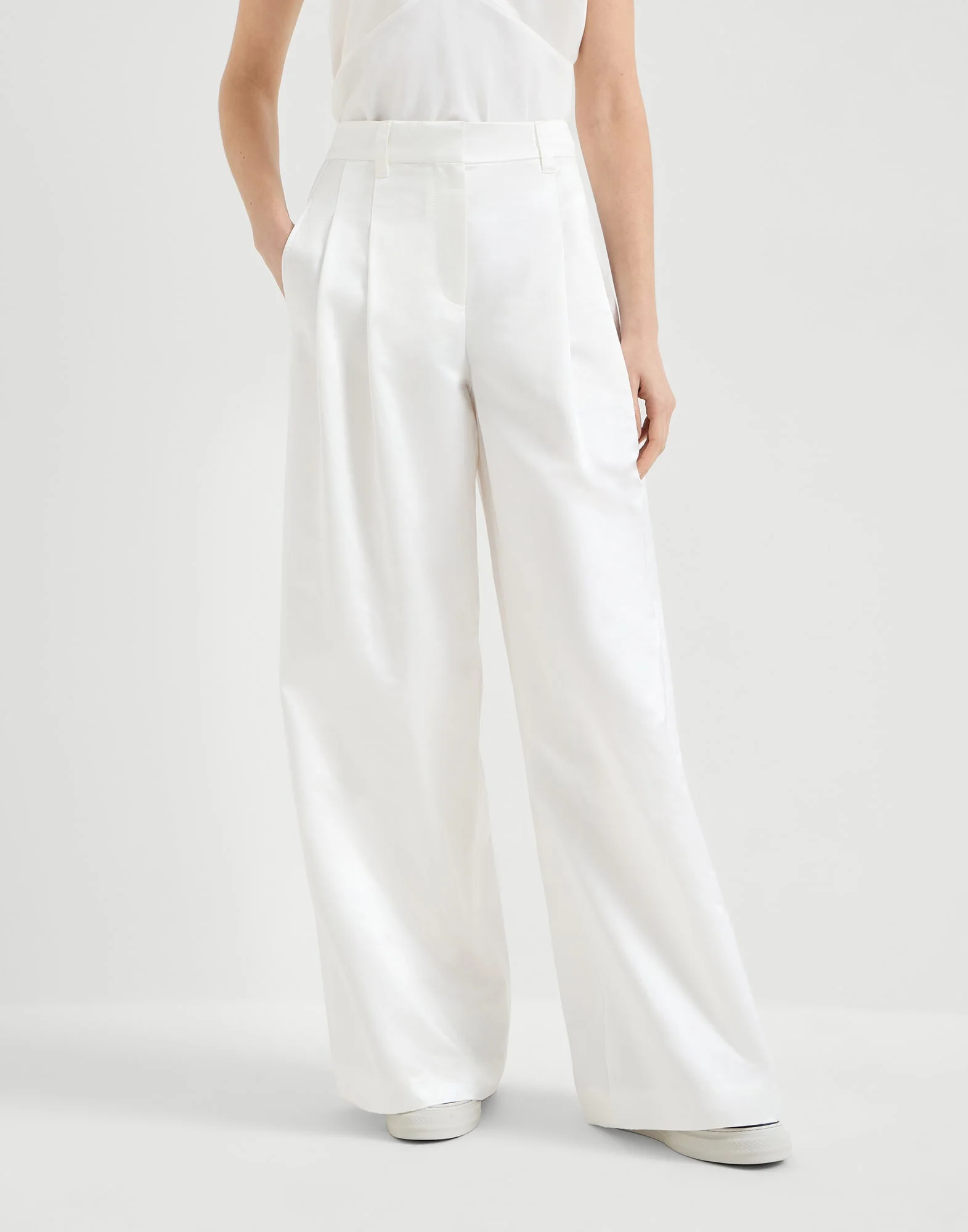 Fluid lines and sophisticated embellishments define the style of these cotton and silk loose pleated trousers. The fabric’s natural fluidity and sheen enhance the lines of the garment, which fall soft and wide down the leg. The double pleats create a refined, impeccable look, while an iconic shiny monili detail completes the design with a feminine sparkle. MATERIALS Cotton an silk satin combines the softness and sheen of silk with the resistance and breathability of cotton, while the fluid twill stands out for its light, very fluid and, at the same time slightly crisp appearance. DETAILS Zip closure with metal hooks and backing button Vertical front pockets Double pleat Back welt pockets Plain hem Nickel-free monili decoration 68% COTTON, 32% SILK