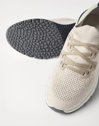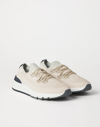 The classic yarns of Brunello Cucinelli knitwear inspire the elegant, sporty feel of these sneakers. The upper is made of a very lightweight, stretch chine knit, which showcases a compact appearance on the sides with "micro-perforations" on the toe, a detail characteristic of sporty accessories. The elasticity of the knit guarantees an optimal fit and comfort. MATERIALS The cotton knit combines natural and synthetic fibers as well as a small percentage of spandex to provide optimal comfort. Its unlined construction and EVA bottom offer lightness. DETAILS Flat fabric laces Unlined Sole in lightweight micro rubber Detachable insole 89% COTTON, 10% NYLON, 1% ELASTANE