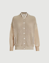 Versatile and essential, this cotton cardigan reinterprets a casual garment in an elegant way. Timeless English rib knitting is paired with the ethereal, feminine lightness of the organza sleeves, resulting in an unexpected play of textures. The red and white stripe detail highlights the collar and pockets, introducing a delicate color accent. MATERIALS The cotton yarn is soft, lightweight and breathable, making it ideal for summer and spring garments. DETAILS Snap closure Ribbed collar Unstructured shoulder Shirt-style cuffs Rib knit hem Vertical hand pockets English rib 100% COTTON