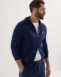 Iconic Brunello Cucinelli workmanship updates the look of this classic, sporty sweatshirt-like style from the Travelwear line, dedicated to moments of relaxation and leisure. Cotton English rib knitting elevates the essential design of the sweater, featuring a zipper closure and hood. The Solomeo logo completes the garment with an elegant note. MATERIALS Manufacturing of the pure cotton yarn enhances the qualities of the natural fibers and makes the garment lightweight and comfortable to wear. DETAILS Two-way zip closure Adjustable drawstring hood Rib knit cuffs and bottom band Patch hand pockets English rib 100% COTTON
