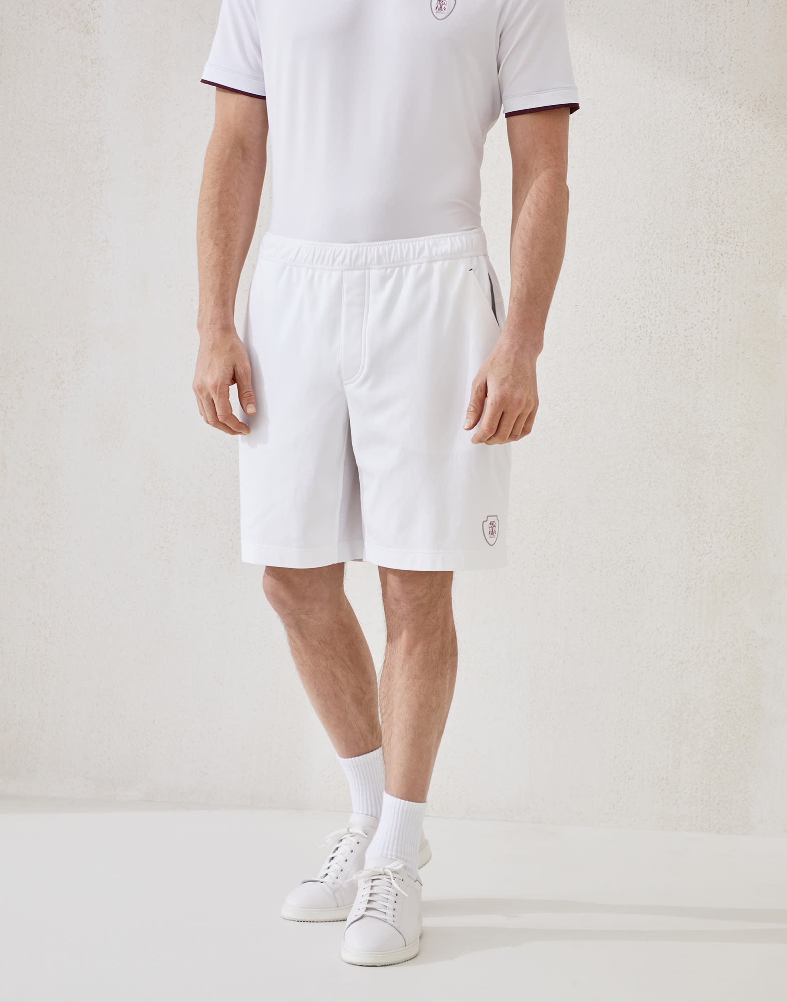 The sporty yet elegant feel of the world of Tennis inspires a selection of creations that enrich the Menswear collection. Pure cotton interlock fabric enhances the comfort of these classic Bermuda shorts, a casual and versatile garment completed by an inner drawstring. The Tennis logo finishes the design with an iconic detail. MATERIALS Interlock is a lightweight, soft fabric which showcases the distinct look of jersey on both sides. DETAILS Elastic waistband with drawstring Slanted front pockets Back welt pocket with button Plain hem 100% COTTON