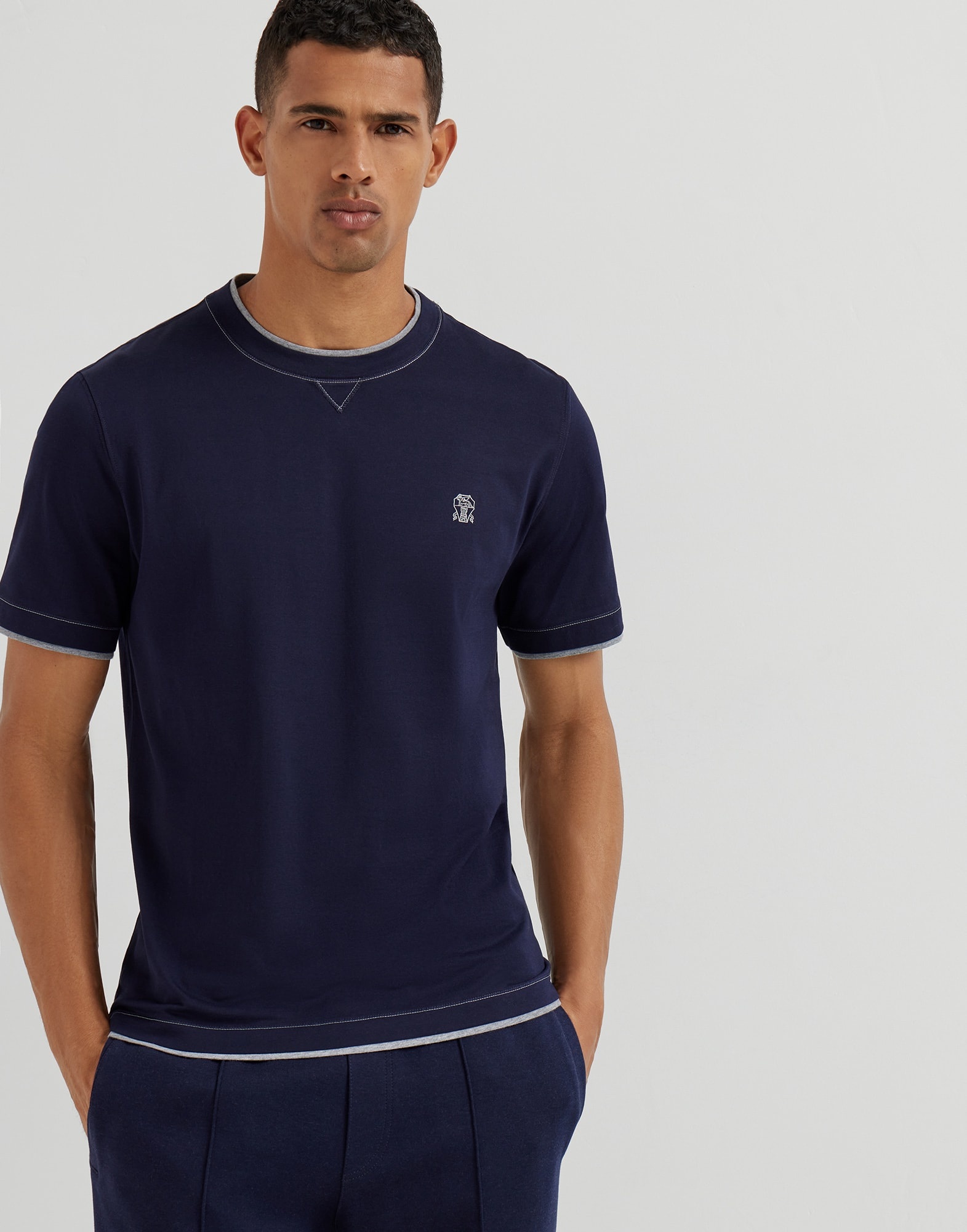Refined details enhance this classic crew-neck T-shirt in soft cotton jersey from the Travelwear line, dedicated to moments of relaxation and free time. The contrasting inserts create a layered effect that highlights the edge of the crew-neck, sleeves and bottom, while the Solomeo crest on the chest references the origins and values of the brand. The silhouette features regular proportions. MATERIALS The exquisite quality of the natural cotton fibers enriches the soft jersey, a lightweight fabric with a smooth, fluid hand. DETAILS Crew-neck with triangle Sleeves with flat pressed hem Flat pressed hem 100% COTTON
