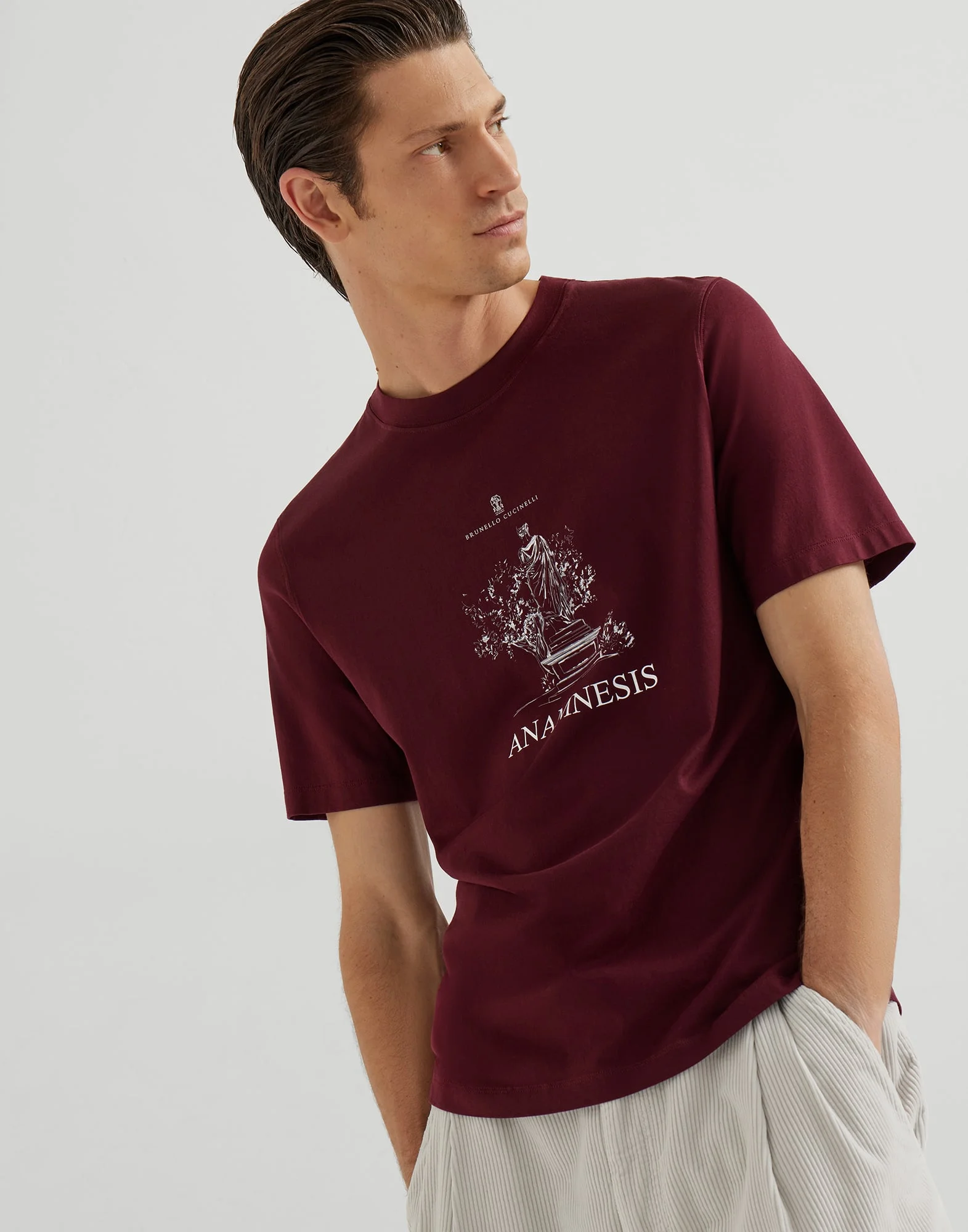 Creative inspiration and refined materials come together in the essential silhouette of this short sleeve crew-neck T-shirt. The pure cotton jersey’s smooth, compact texture is brought to life by the contrasting “Anamnesis” graphic, which references the value of reflection and knowledge. The garment showcases straight, comfortable lines. MATERIALS Fine natural cotton fiber enriches the soft jersey, a lightweight fabric with a soft, fluid hand. DETAILS Crew-neck Sleeves with flat pressed hem Flat pressed hem Regular fit 100% COTTON