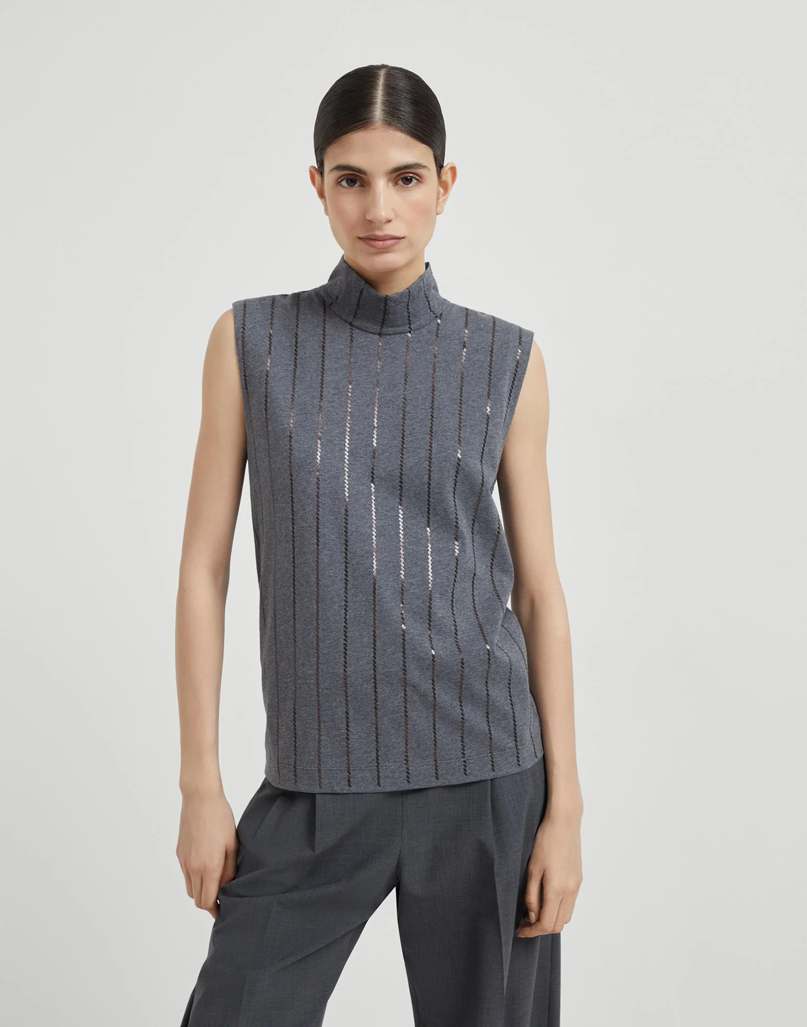 Cotton jersey turtleneck top with dazzling chalk stripe embroidery