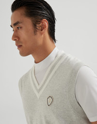 The excellence of Brunello Cucinelli materials is paired with the natural sophistication of the world of Golf in this pure cotton sweater vest. The characteristic properties of the yarn make this garment soft and cozy, in a design accentuated by the V-neck with contrasting edge. The logo on the chest enriches the style with an iconic touch. MATERIALS Manufacturing of the pure cotton yarn enhances the qualities of the natural fibers and makes the garment lightweight and comfortable to wear. DETAILS Rib knit V-neck Sleeves with rib knit cuffs Rib knit hem 100% COTTON