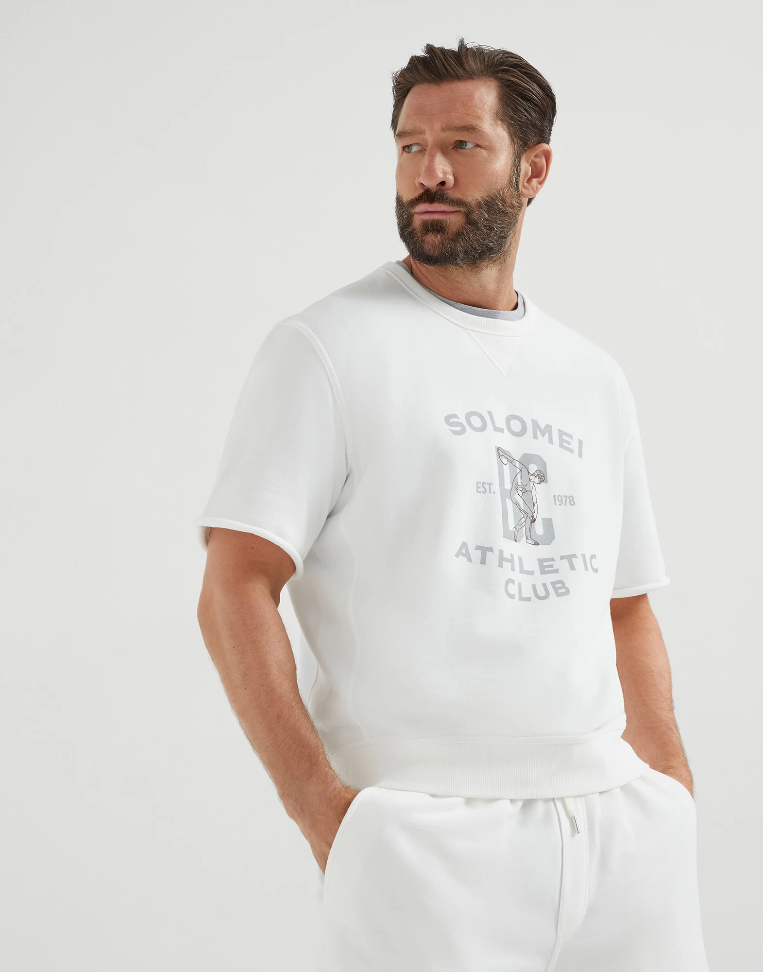 Refined materials enrich the sporty style of the Travelwear line, dedicated to moments of relaxation and leisure. The pure cotton yarn defines the soft, light texture of the short sleeve sweatshirt, made of smooth French terry with the characteristic irregular texture on the inside. The graphic and the unfinished roll hems complete the garment’s casual feel. MATERIALS Natural cotton fibers enrich the fluid, compact texture of the smooth French terry fabric, characterized by its unbrushed finish that makes it light and slightly rustic on the inside. DETAILS Crew-neck in rib knit with triangle Raw edge effect at cuffs Ribbed bottom band 100% COTTON