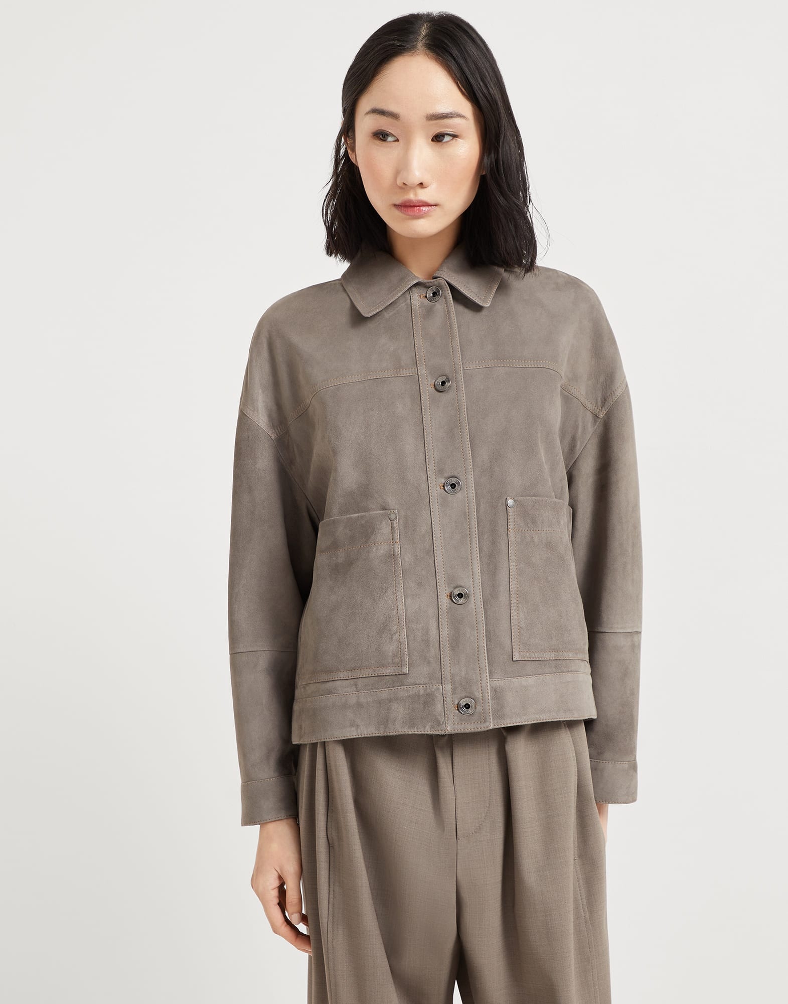 Refined Brunello Cucinelli materials reinterpret the retro style of this new Couture suede jacket in a precious, feminine way. The double stitching stands out on the leather’s elegant texture, giving it a casual appearance, emphasized by the two large pockets on the front. The silhouette features relaxed proportions with dropped shoulders and generous sleeves. The iconic monili embroidery completes the garment with a delicate sparkle. MATERIALS Couture suede is a leather that combines a compact look, inspired by country style, with a soft and pleasantly velvety hand. The acetate and silk fabric lining ensures added comfort. DETAILS Metal button closure Unlined Patch hand pockets Button cuffs Nickel-free monili decoration 100% REAL LEATHER