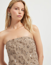 This crispy silk couture dress with swing drops embroidery conveys a sophisticated, feminine allure. The crisp, weightless texture of the fabric stands out with a precious embroidery of shimmering sequins, applied in different shapes and sizes to create a three-dimensional effect that brings the essential silhouette to life, playing with delicate reflections and transparency. The curvy, fitted lines enhance the distinctly feminine feel of the dress. MATERIALS Refined Crispy silk is an ultra fine fabric characterized by a transparent, matte look. The fabric’s delicate color stems from a particular dye that preserves the fiber’s natural textured effect. DETAILS Side zip closure Silk-blend crepe lining Off-the-shoulder style 100% SILK