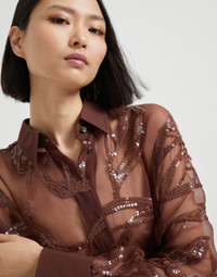 A precious embellishment of the season elevates the sophisticated, ethereal feel of this crispy silk shirt with dazzling floral embroidery. Inspired by the beauty of nature, the shimmering abstract floral design is crafted using a sequin embroidery that illuminates the shirt with an elegant sparkle. The silhouette is defined by the slightly full sleeves and dropped shoulders that give the shirt a casual elegance. MATERIALS Refined Crispy silk is an ultra fine fabric characterized by a transparent, matte look. The fabric’s delicate color stems from a particular dye that preserves the fiber’s natural textured effect. DETAILS Concealed button closure Classic collar Cuffs have one mother of pearl button 100% SILK