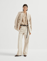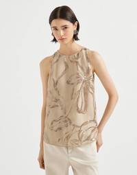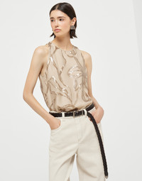 A precious embellishment elevates the style of this Crispy silk top with a sparkling floral embroidery. The season’s shiny embroidery, formed by small, shimmering sequins creating a special relief-effect design with faceted reflections, stands out on the pure Crispy silk base. The loose silhouette is complemented by the classic crewneck and by a teardrop opening behind the neck that makes wearing easy. MATERIALS Refined Crispy silk is an ultra fine fabric characterized by a transparent, matte look. The fabric’s delicate color stems from a particular dye that preserves the fiber’s natural textured effect. DETAILS Teardrop opening with button at back of neck Crew-neck Silk-blend crepe lining 100% SILK