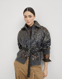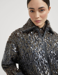 Precious embroideries and refined materials enrich this new dazzling degrade embroidery cardigan in mohair and wool. A shimmering cascade of different colored sequins illuminates the garment’s surface with its reflections, creating a nuanced design. The embroidery is applied to a mohair and wool net-like knit base that gives the pattern a soft, full appearance. The zipper closure completes the cardigan with a functional element. MATERIALS The style showcases a refined degrade embroidery made of two colors of sequins: one tonal to the base and the other a contrasting color. The two together create sophisticated, shiny shading. The embroidery is made on a knitted net-like base of brushed mohair and wool, and is performed vertically to preserve the garment’s structure and elasticity. DETAILS Two-way zip closure Drop shoulder Wide sleeve Hand pockets Special workmanship 81% MOHAIR, 11% NYLON, 8% WOOL